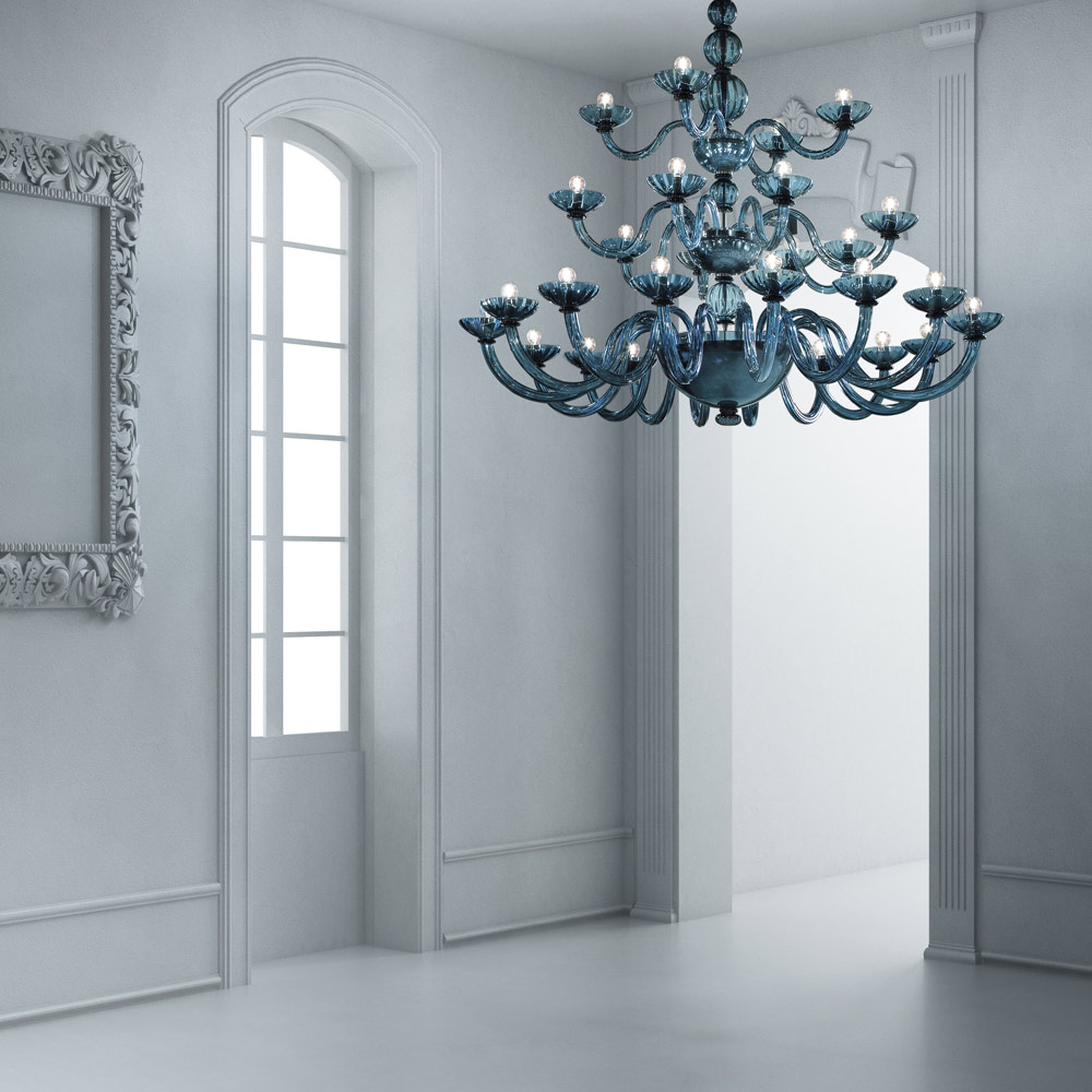 Lustre artesanal de 28 luzes feito de vidro Venice com acabamento em jeans com pingentes de chumbo e detalhes em metal cromado polido . Uma peça de mobiliário com uma presença surpreendente e icónica caracterizada por uma linha suave e delicada e curvas refinadas que se adaptam perfeitamente a ambientes clássicos mas ao mesmo tempo também a espaços de estilo contemporâneo. O elemento de tradição é pontuado por seus maravilhosos componentes em vidro soprado inteiramente feito à mão que se transforma para se atualizar graças às cores da moda. Suas formas envolventes o tornam um elemento ideal para ocupar qualquer ambiente, tanto doméstico quanto contratual, com classe e dinamismo .