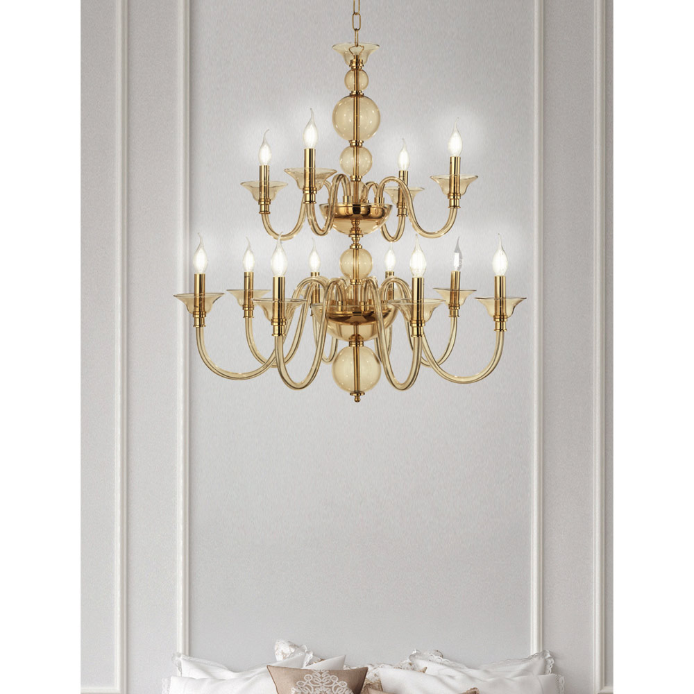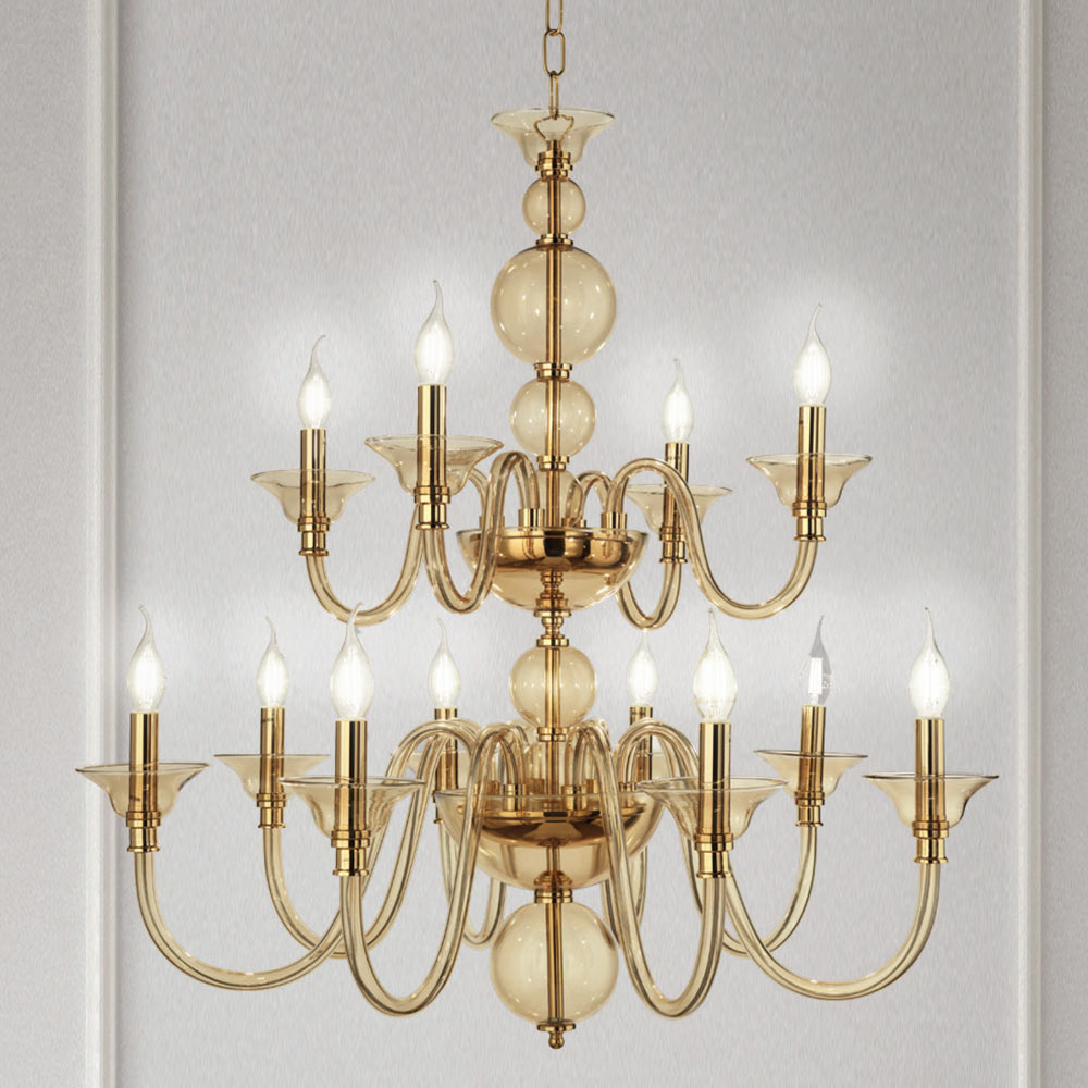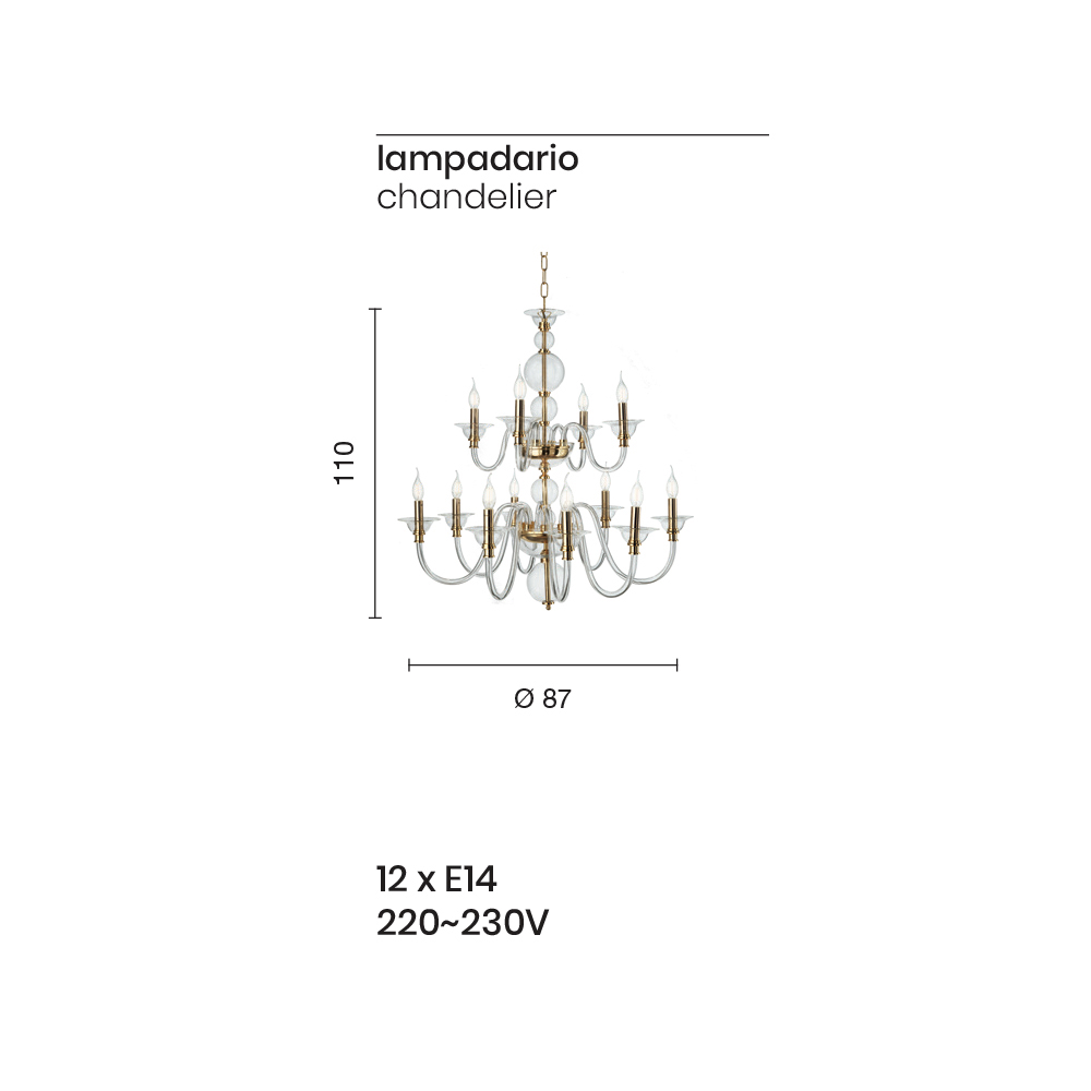 design clássico e luxuoso é composto por esferas posicionadas umas sobre as outras para o corpo de luz, que permitem vislumbrar o núcleo metálico dourado, e de 12 braços arqueados , totalmente feito em