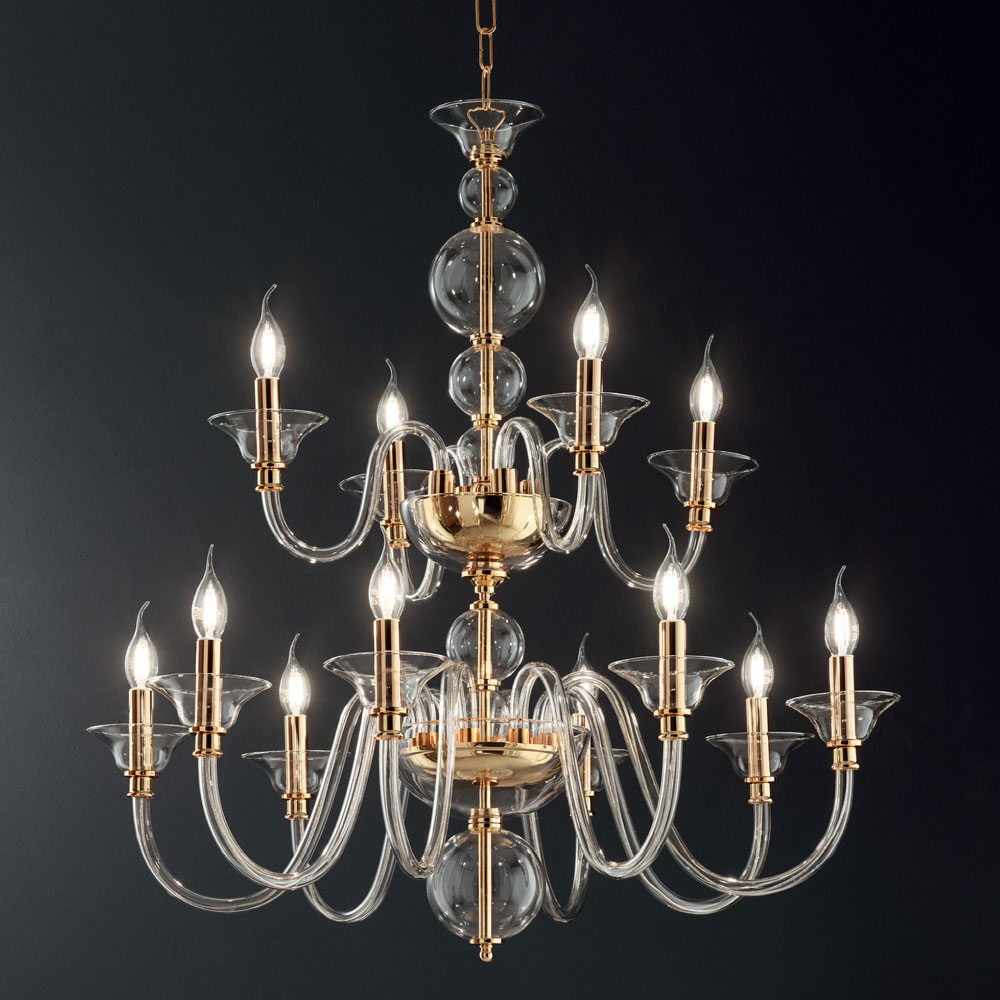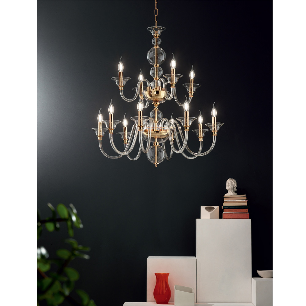 Lustre clássico de 12 luzes em metal dourado e vidro artesanal, luxo fabricado na Itália.