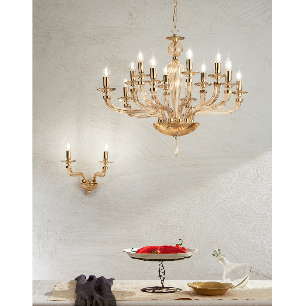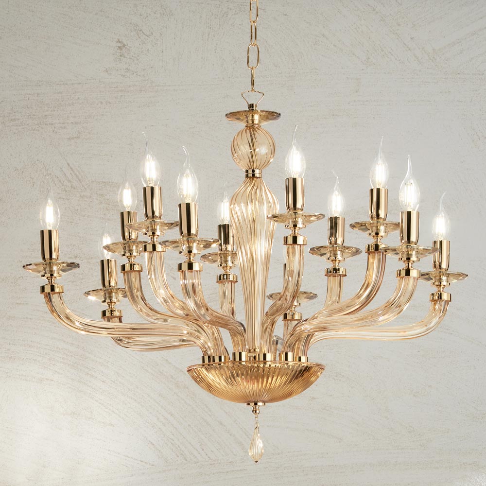 Este lustre pendente de estilo clássico é composto por 12 braços curvos feitos de vidro feito à mão na Itália com efeito "rigaton" com acabamento âmbar que sustentam os pires que abrigam as fontes de luz.
