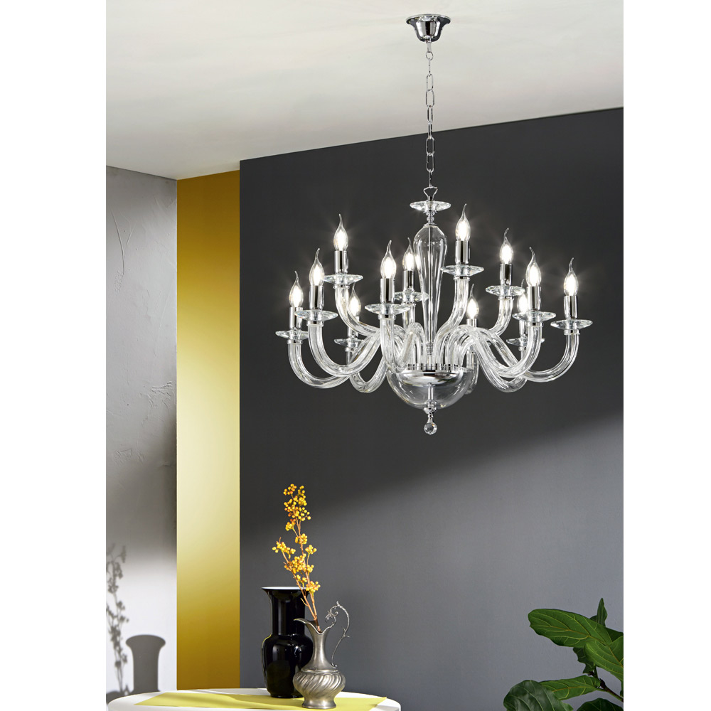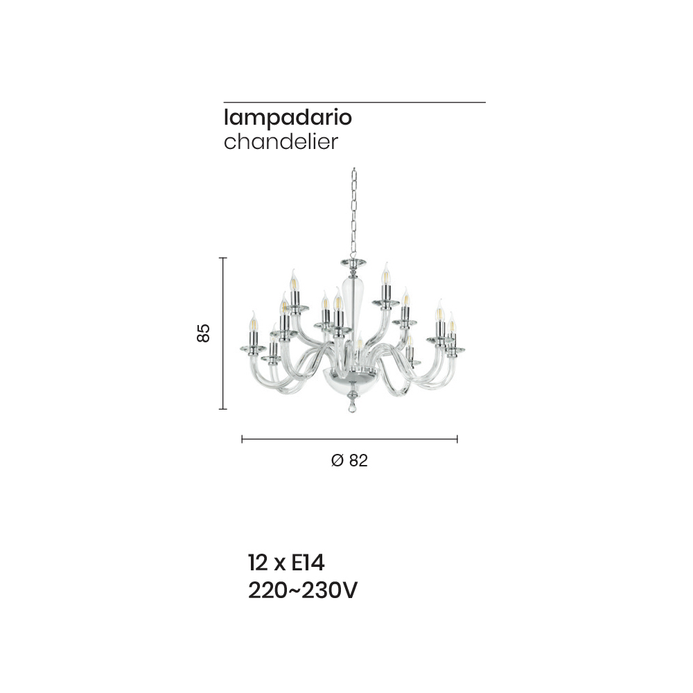Feitas com 12 braços arqueados em vidro transparente artesanal com detalhes em metal cromado , as placas de cristal lapidado abrigam as fontes de luz.