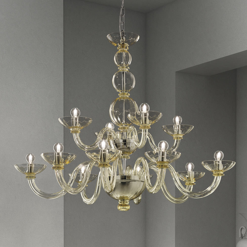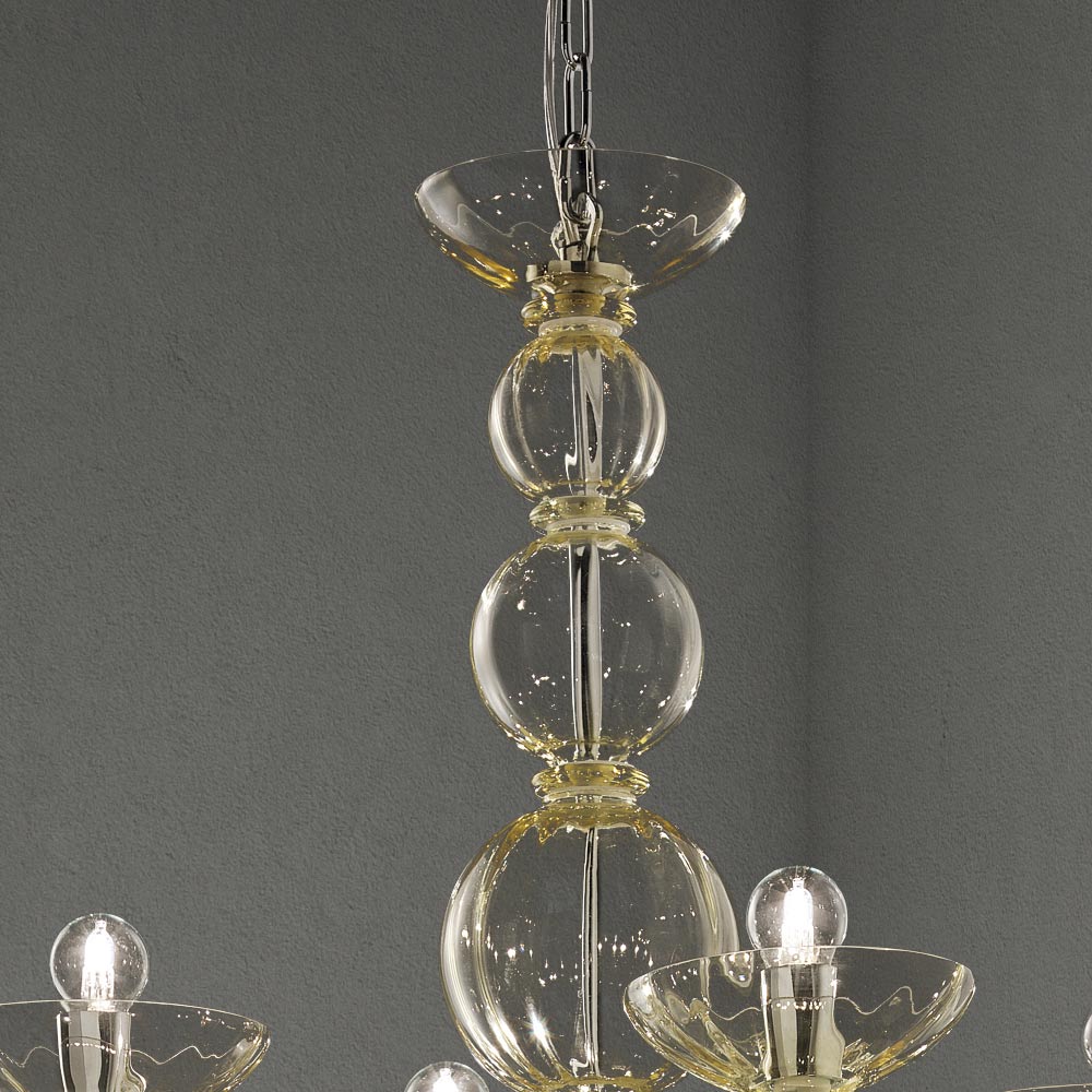 Candelabro com 12 luzes em vidro Veneza, acabamento topázio trabalhado à mão com detalhes em metal cromado polido . Uma peça de mobiliário com uma presença surpreendente e icónica caracterizada por uma linha suave e delicada e curvas refinadas que se adaptam perfeitamente a ambientes clássicos mas ao mesmo tempo também a espaços de estilo contemporâneo. O elemento de tradição é pontuado por seus maravilhosos componentes em vidro soprado inteiramente feito à mão que se transforma para se atualizar graças às cores da moda. Suas formas envolventes o tornam um elemento ideal para ocupar qualquer ambiente, tanto doméstico quanto contratual, com classe e dinamismo .
