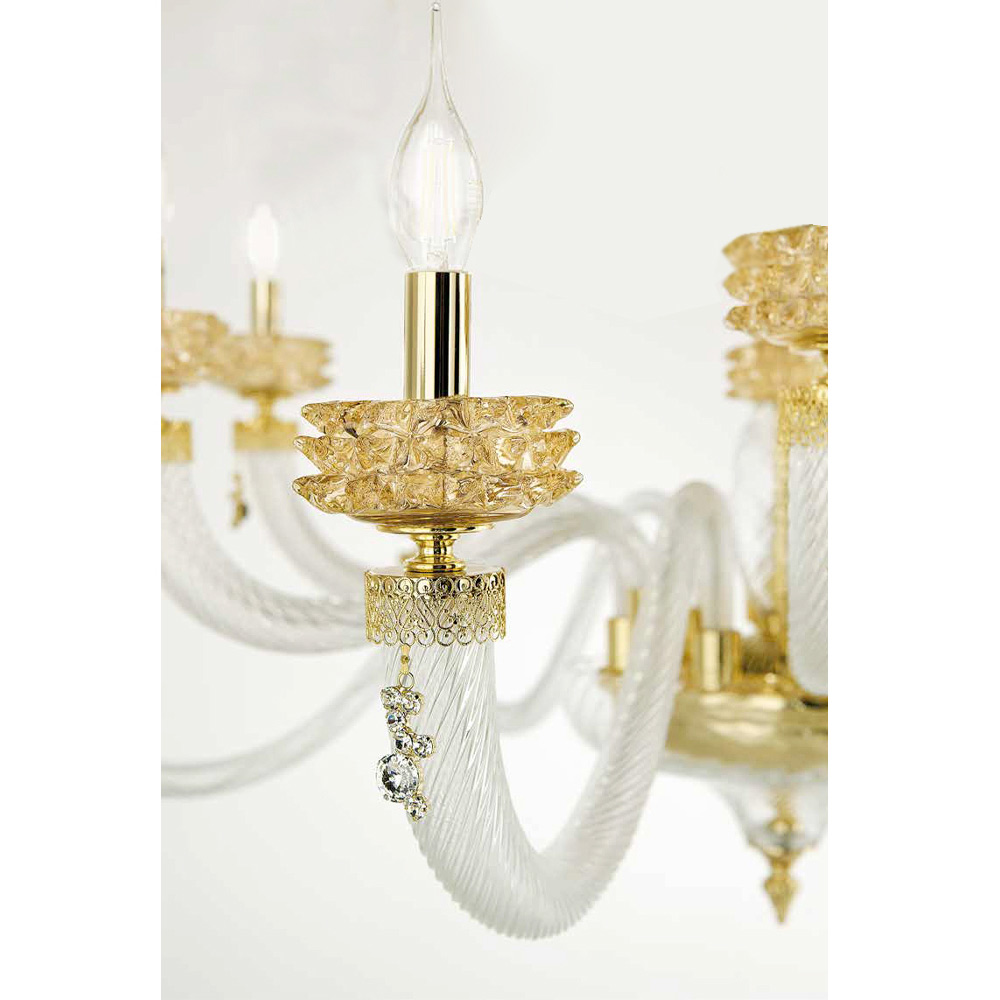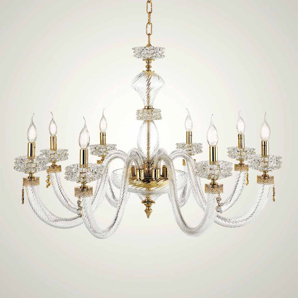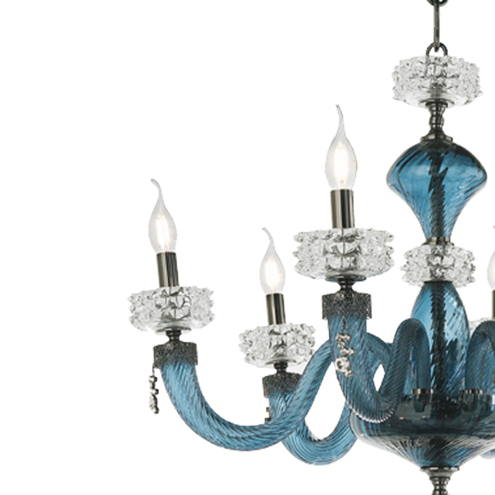 Candelabro de 8 luzes em vidro e metal artesanal, design de luxo italiano.