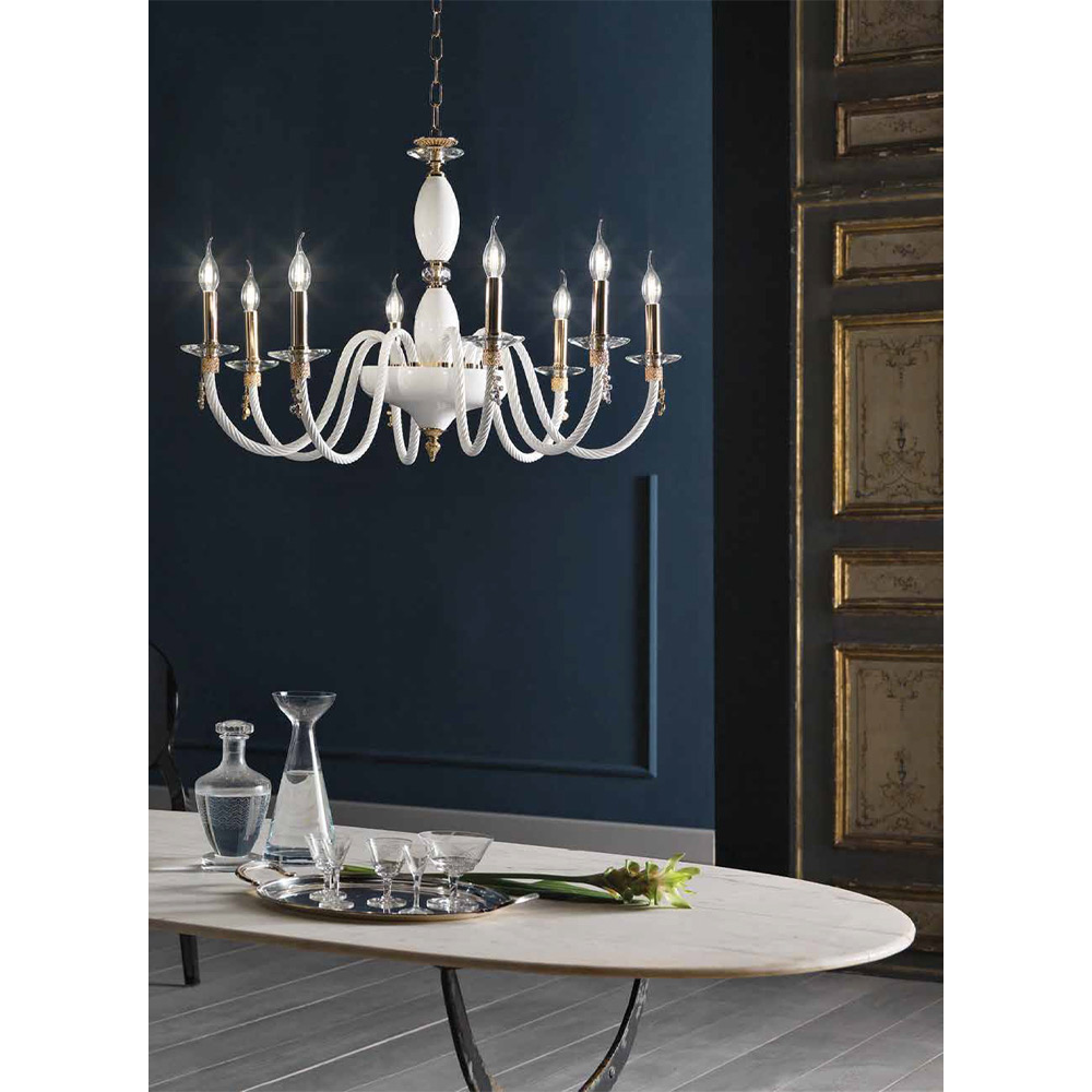 Lustre de 8 luzes em vidro soprado e detalhes em joias, luxo italiano.