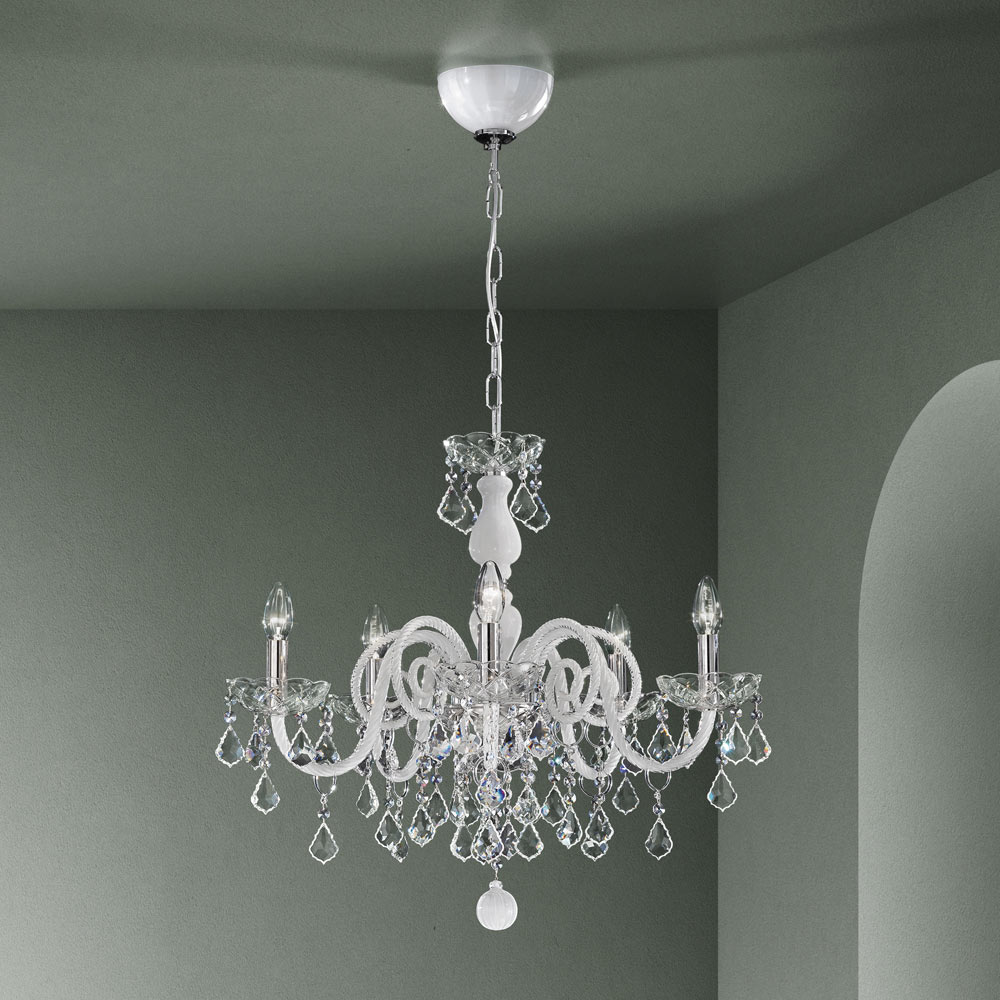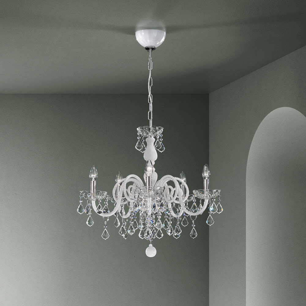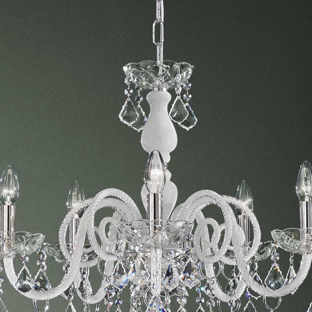 Lustre em vidro veneziano com acabamento branco leitoso com pingentes de chumbo e detalhes em metal cromado polido . Feito artesanalmente , este complemento é caracterizado pelos maravilhosos braços trabalhados à mão através da técnica de torção que cria um resultado exclusivo que lembra esteticamente o entrelaçamento de uma corda, dando personalidade ao lustre. Uma verdadeira chuva de luz invade a estrutura do candelabro e depois se espalha pelo ambiente circundante por meio de refração através da magia de lantejoulas e pendentes de cristal com finos acabamentos, criando assim um efeito cenográfico evocativo e onírico capaz de encantar e surpreender. por sua elegância e majestade .