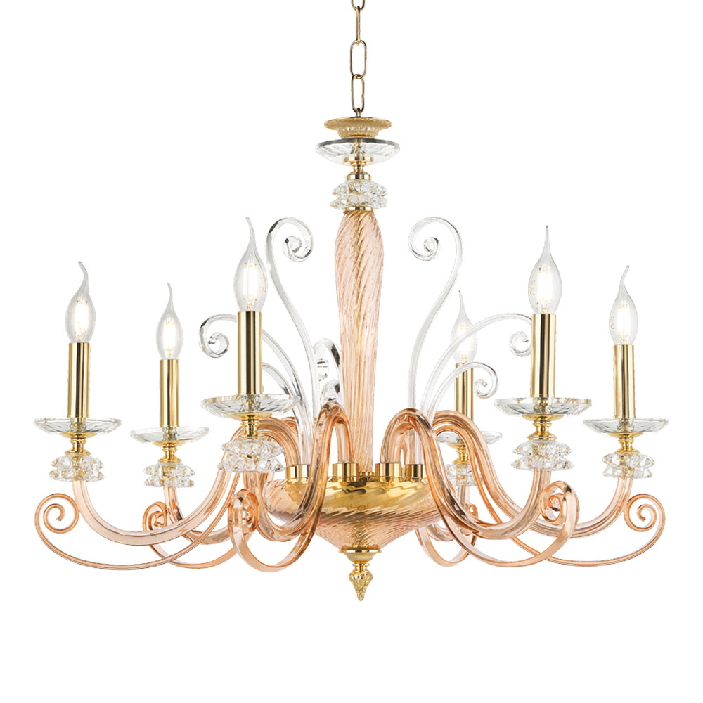 Candelabro artesanal de 6 luzes em vidro soprado e cristal óptico, luxo feito na Itália.