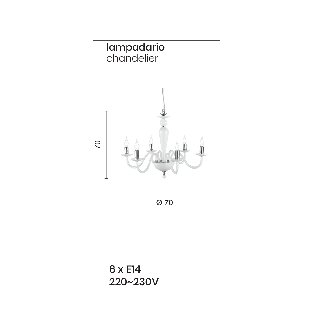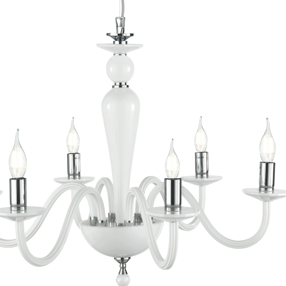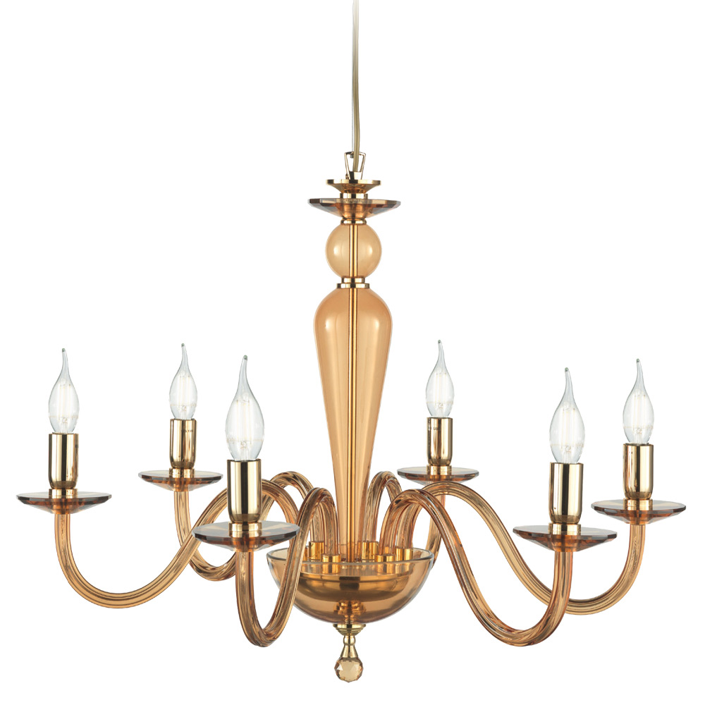 Este lustre pendente de estilo clássico é composto por 6 braços arqueados feitos de vidro artesanal na Itália que sustentam os pires que abrigam as fontes de luz.
