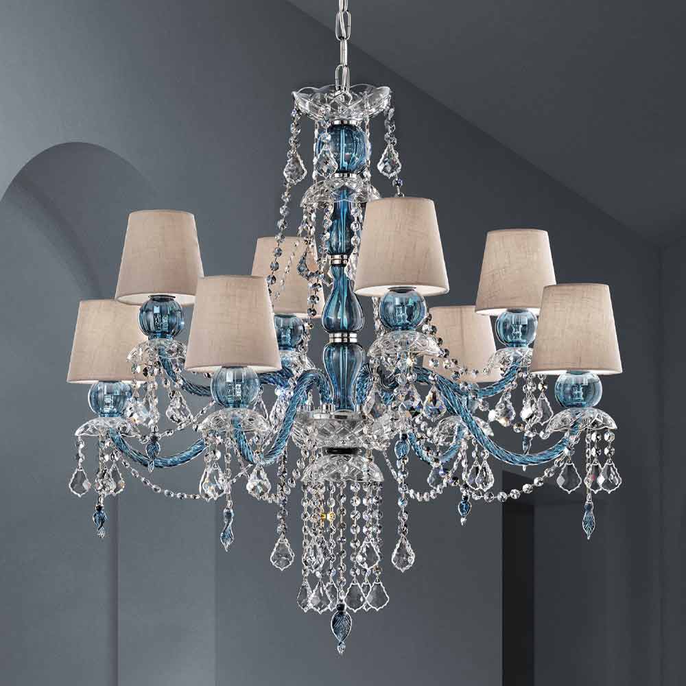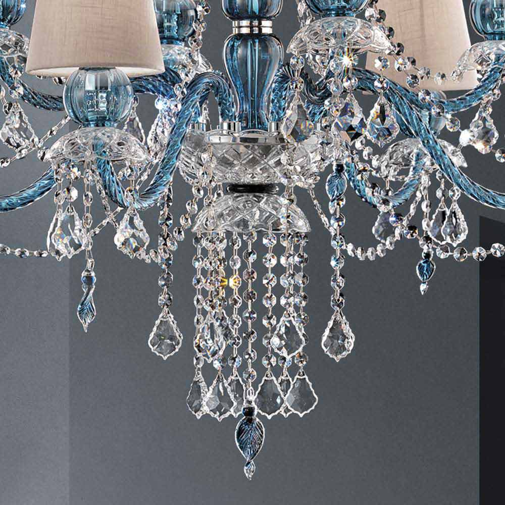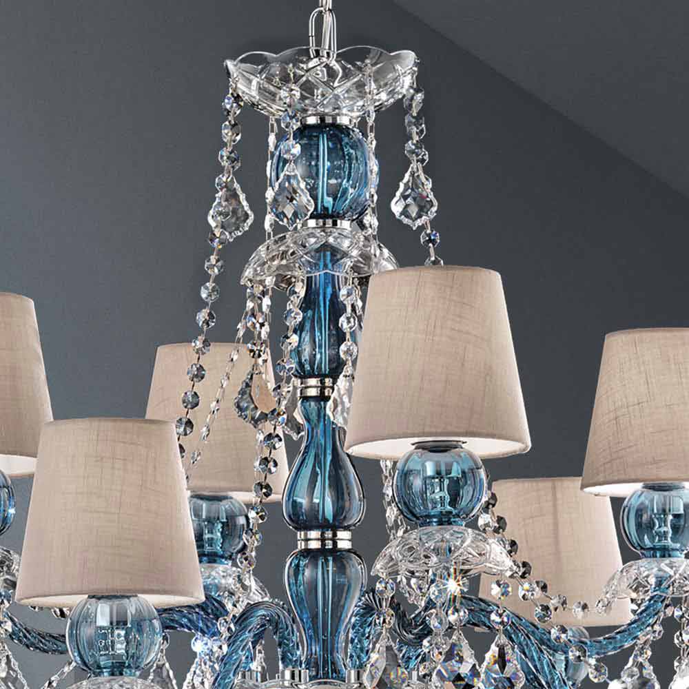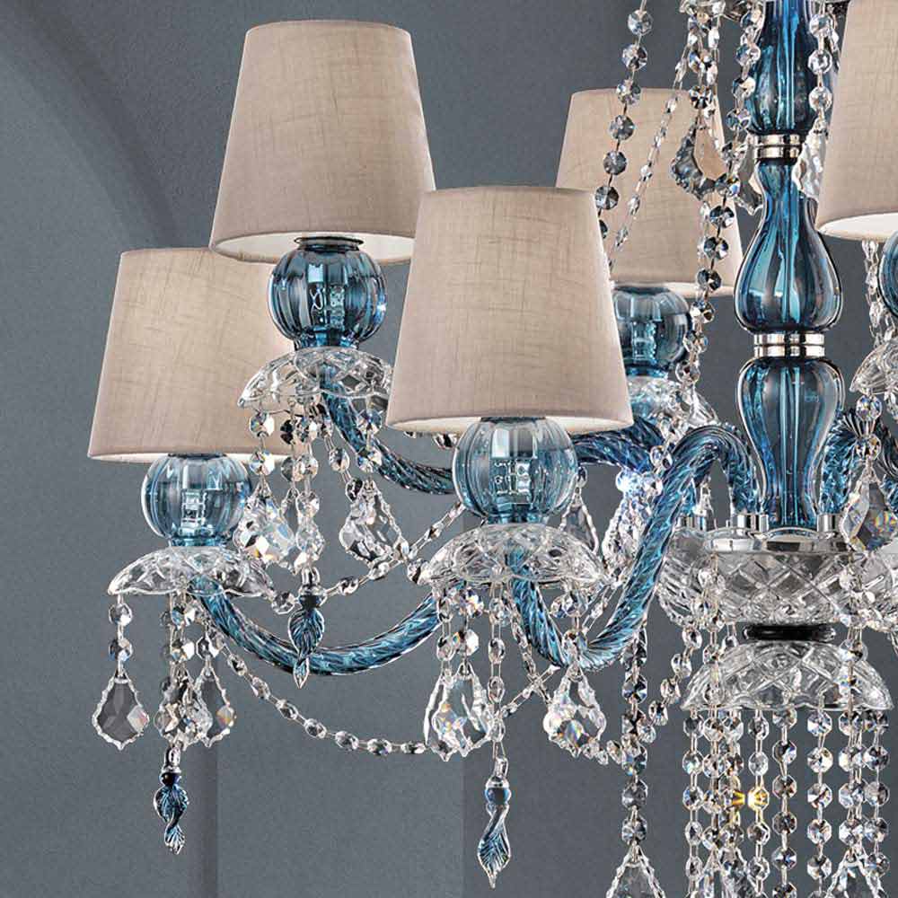 Majestoso lustre de 8 luzes com abajures de linho, estrutura de vidro Veneza acabamento azul enriquecido com pendentes com acabamento em cristal de chumbo e detalhes em metal cromado polido , feito à mão na Itália . Uma peça de mobiliário com um carácter extremamente romântico que completa os quartos criando um ambiente maravilhoso de elegância intemporal. Neste lustre a luz suave converge com o dinamismo dos efeitos de luz inéditos criados pelos brilhantes pendentes que, graças à refração da luz, dão vida a flashes coloridos de forte impacto visual .