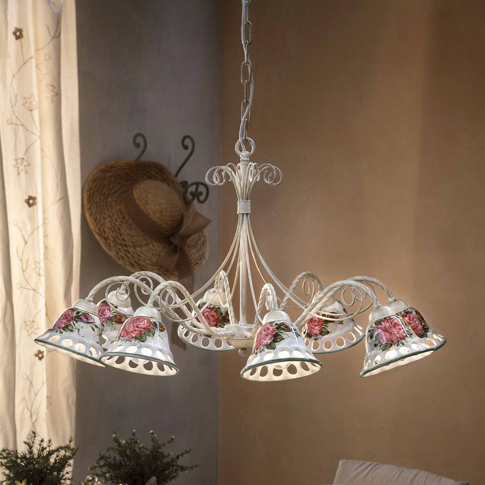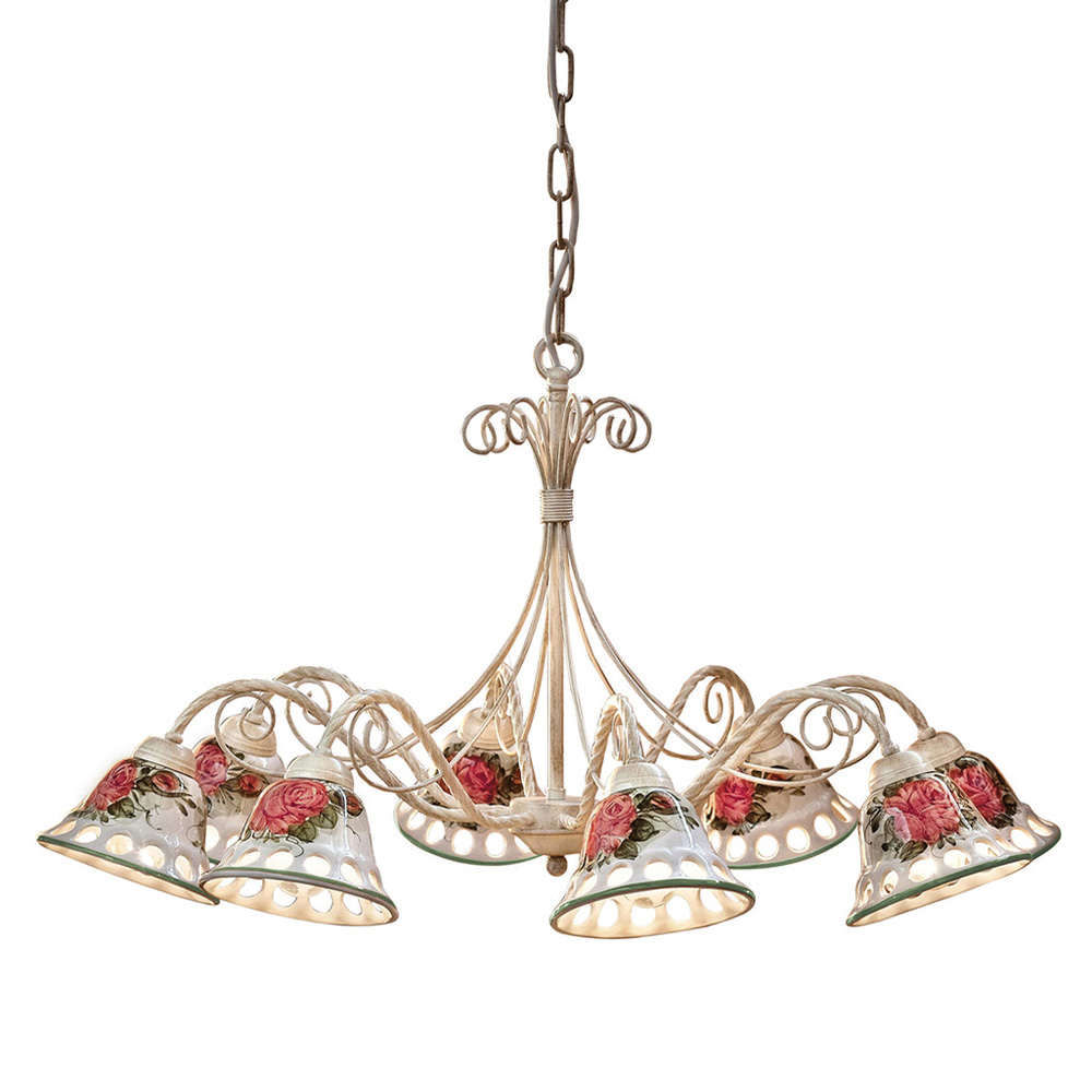Candelabro de 8 luzes em metal e cerâmica artesanal com fitas, fabricado na Itália pela Ferroluce.