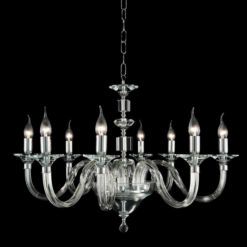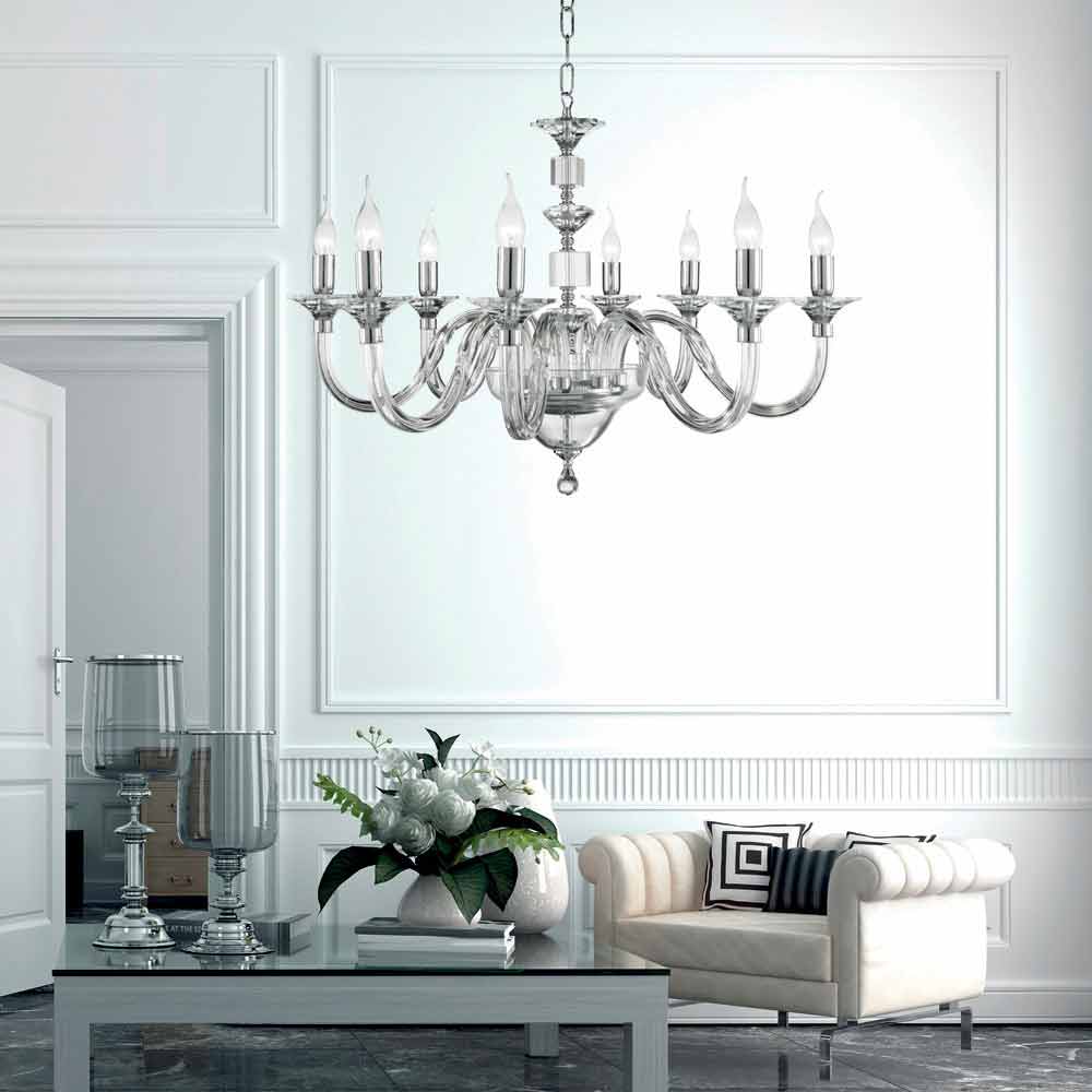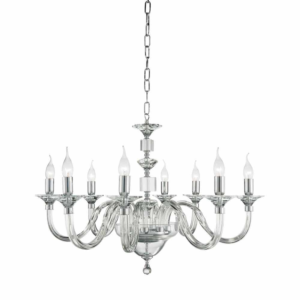 Lustre de vidro com 8 lâmpadas e decorações de cristal Ivy Luminária pendente fabricada na Itália em vidro transparente feito à mão com decorações de cristal. Acabamentos cromados. Lâmpadas: 8 x E14 40W Lâmpadas não incluídas.
