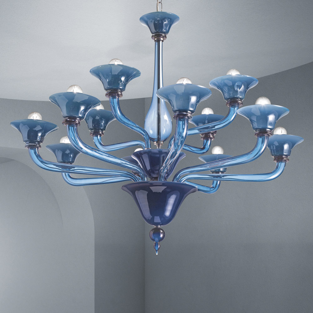 Candelabro artesanal de 12 luzes em vidro azul Veneza Feito na Itália.