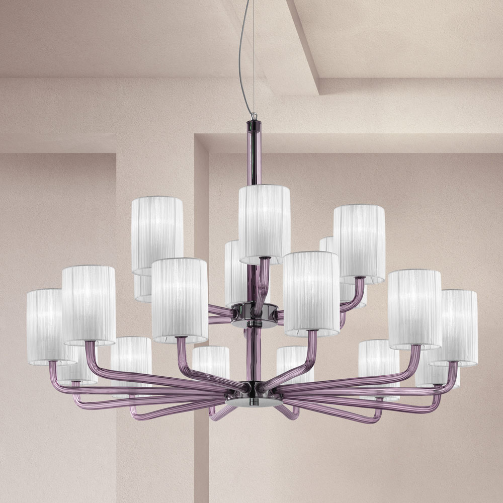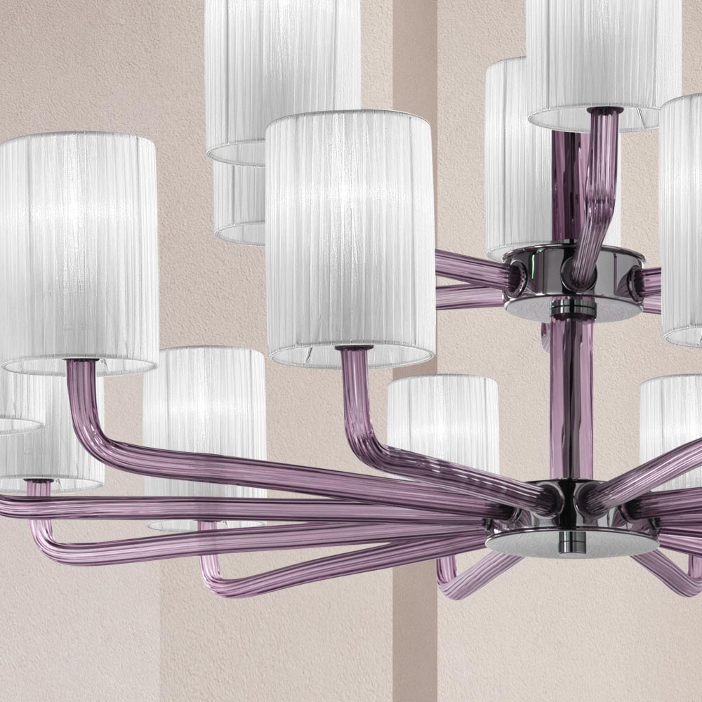 Candelabro de 18 luzes feito na Itália em acabamento artesanal ametista vidro Veneza com detalhes em metal com acabamento cromado polido e abajures em tecido . Uma peça de mobiliário caracterizada por um design articulado, mas essencial , capaz de enriquecer o ambiente dando caráter graças à sua forte presença de palco típica dos lustres clássicos do passado. Os braços tubulares de vidro suportam de forma delicada e elegante os maravilhosos abajures de tecido que ajudam a transportar a luz em todas as direções para uma iluminação quente , suave e envolvente .