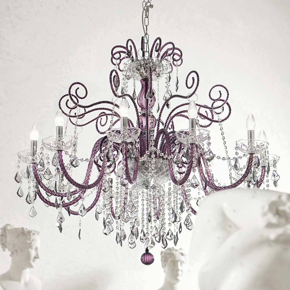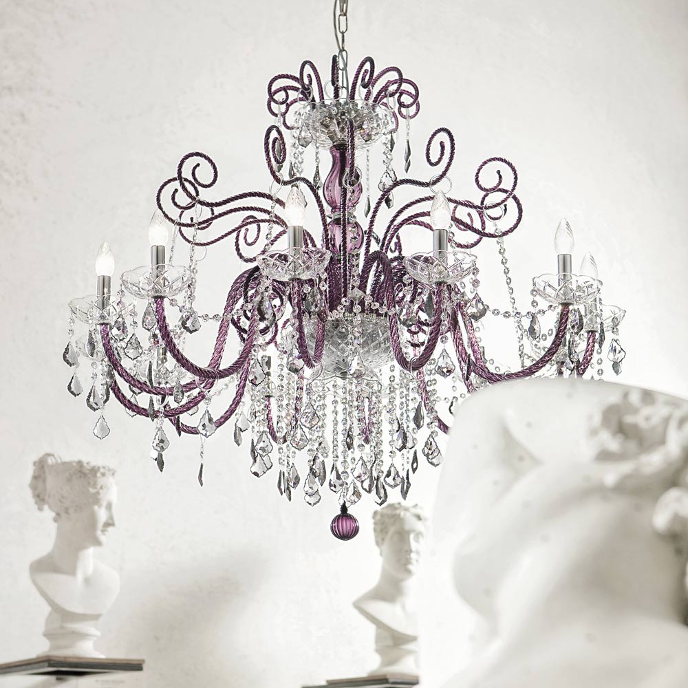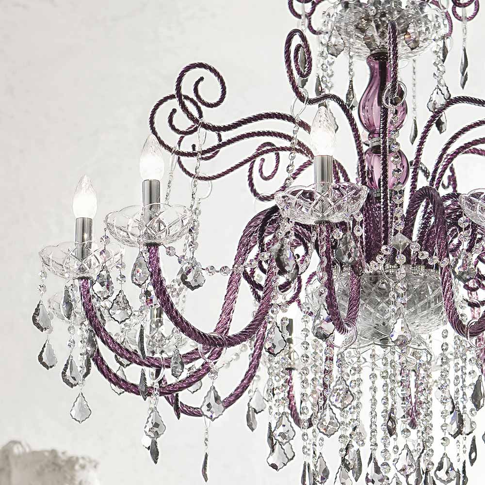 Lustre de 12 luzes de vidro Veneza com acabamento ametista com pingentes de chumbo e metal cromado polido . Feito artesanalmente , este complemento é caracterizado pelos maravilhosos braços trabalhados à mão através da técnica de torção que cria um resultado exclusivo que lembra esteticamente o entrelaçamento de uma corda, dando personalidade ao lustre. Uma verdadeira chuva de luz invade a estrutura do candelabro e depois se espalha pelo ambiente circundante por meio de refração através da magia de lantejoulas e pendentes de cristal com finos acabamentos, criando assim um efeito cenográfico evocativo e onírico capaz de encantar e surpreender. por sua elegância e majestade .