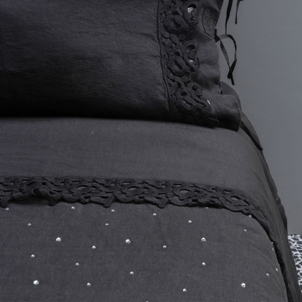 Capa de edredão dupla em linho preto com cristais, botões e aba luxuosa fabricada na Itália.