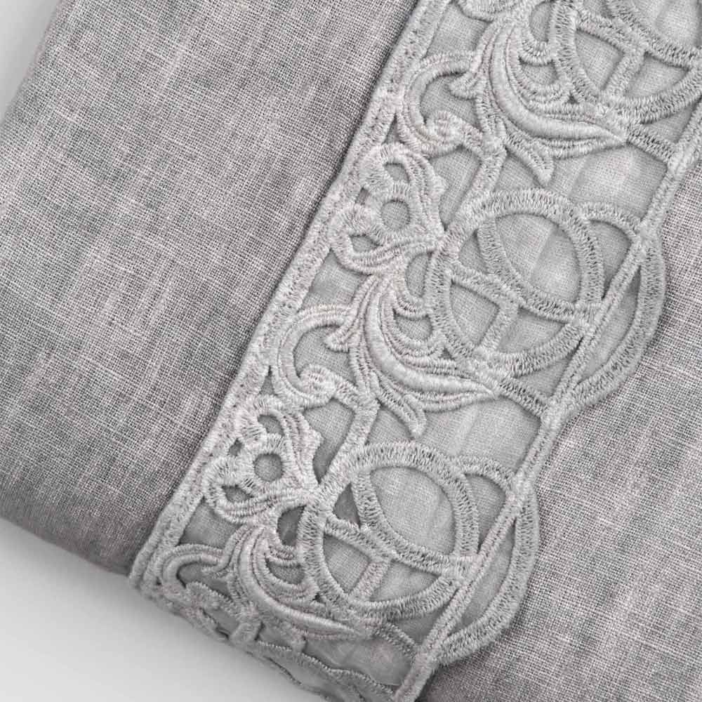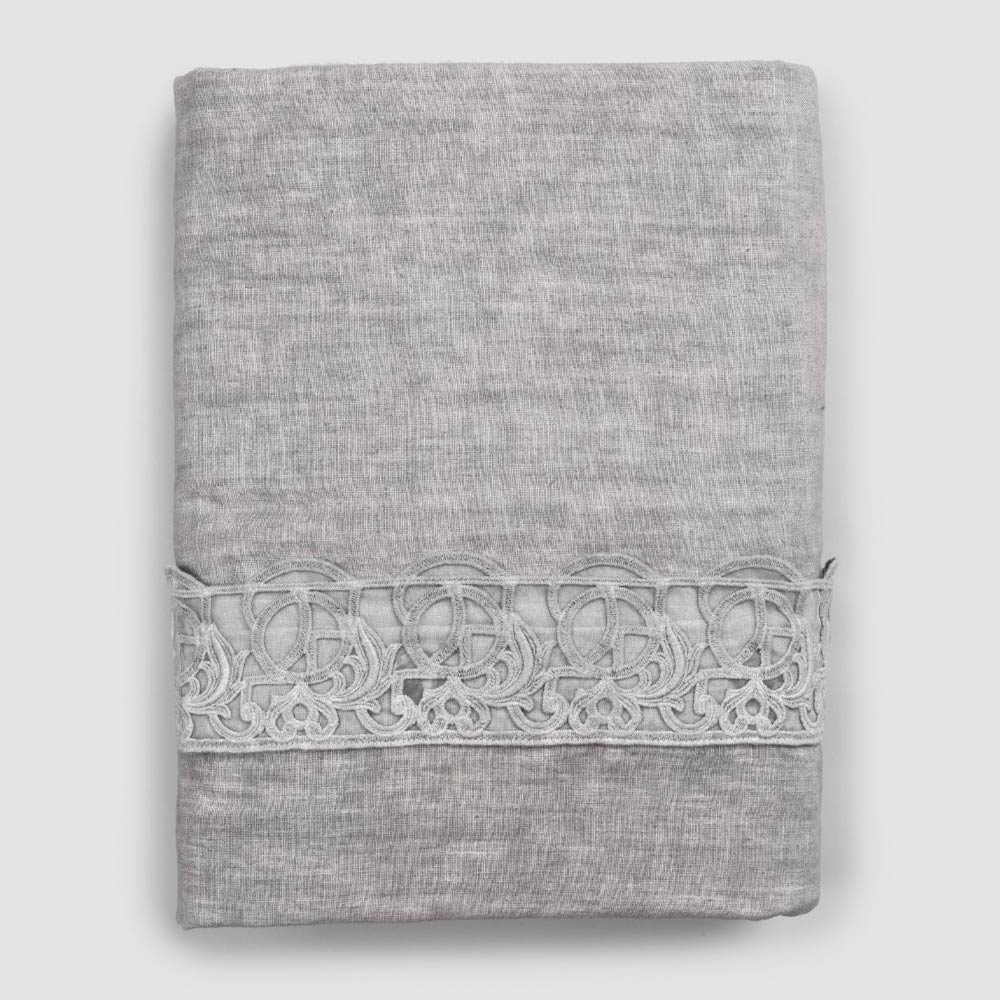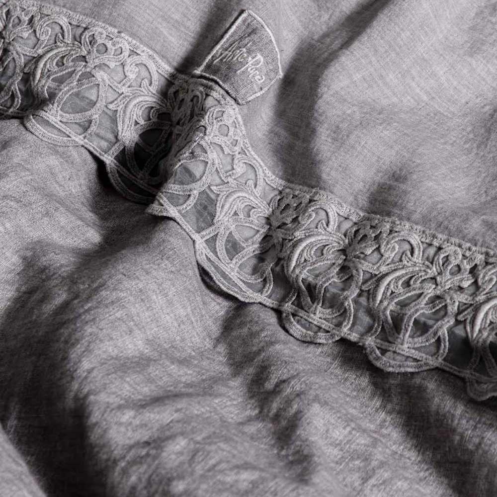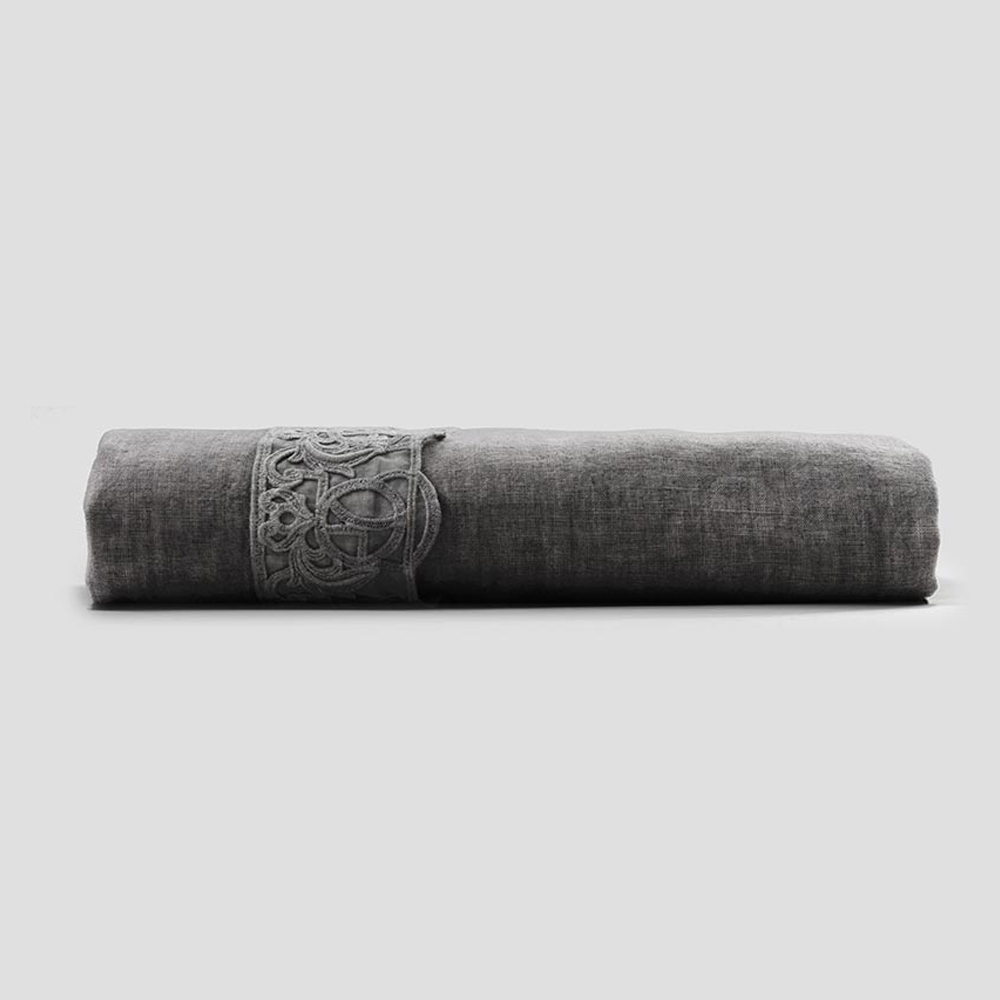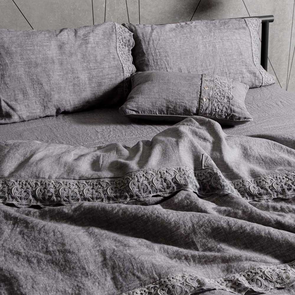 Capa de edredão dupla em linho cinzento com rebordos de renda, de qualidade artesanal made in Italy.