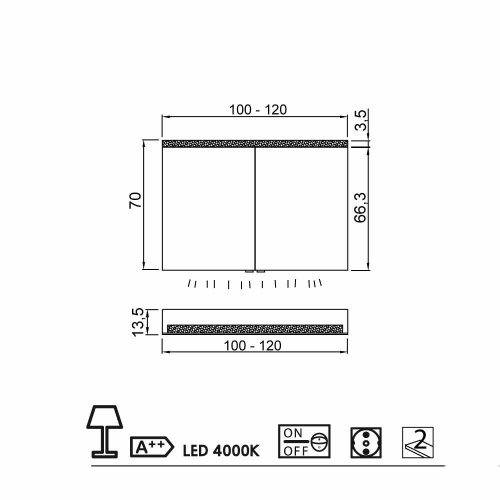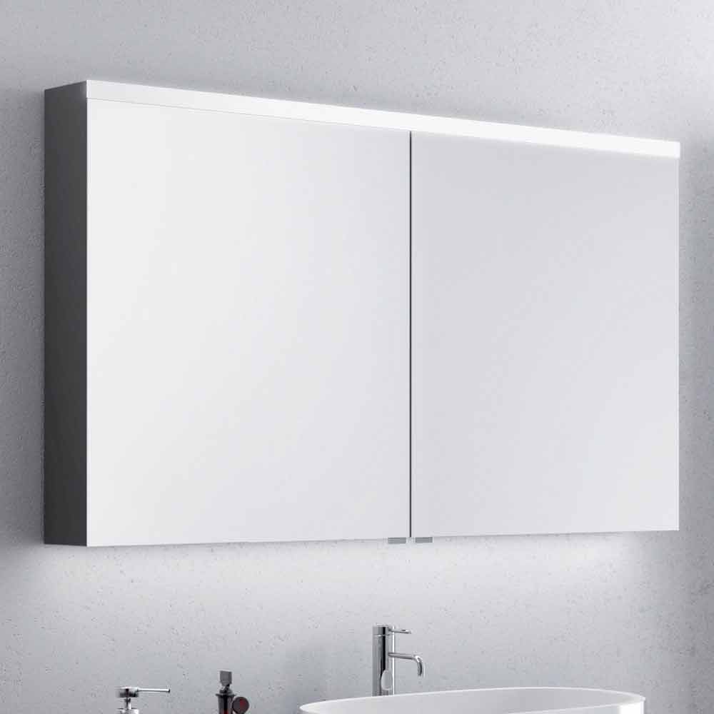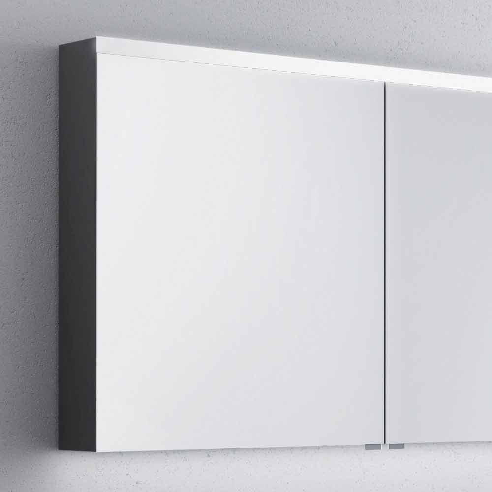 Gabinete de espelho de banheiro com duas portas e iluminação LED. Uma fina linha de luz transmite uma perfeita iluminação frontal, que pode ser facilmente controlada por um sensor.