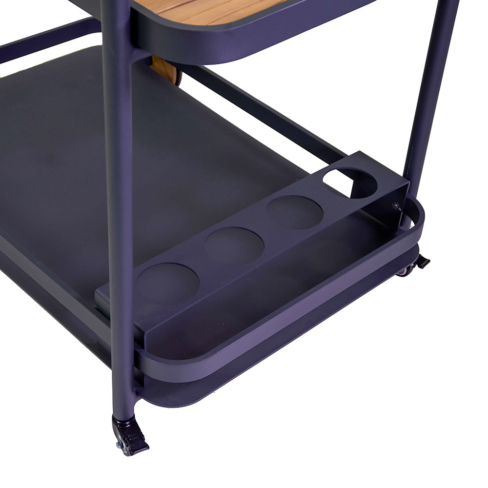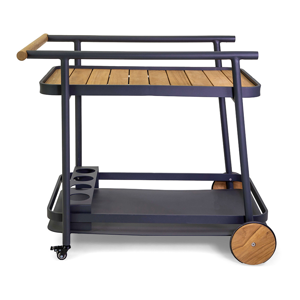 O tampo de madeira de teca adiciona um calor natural e resistência superior aos elementos, tornando-o não apenas bonito, mas também durável. Completo com uma espaçosa prateleira inferior, este carrinho oferece amplo espaço para armazenar pratos, copos e acessórios de servir, enquanto o prático porta-garrafas integrado garante que as suas bebidas estão sempre ao alcance.