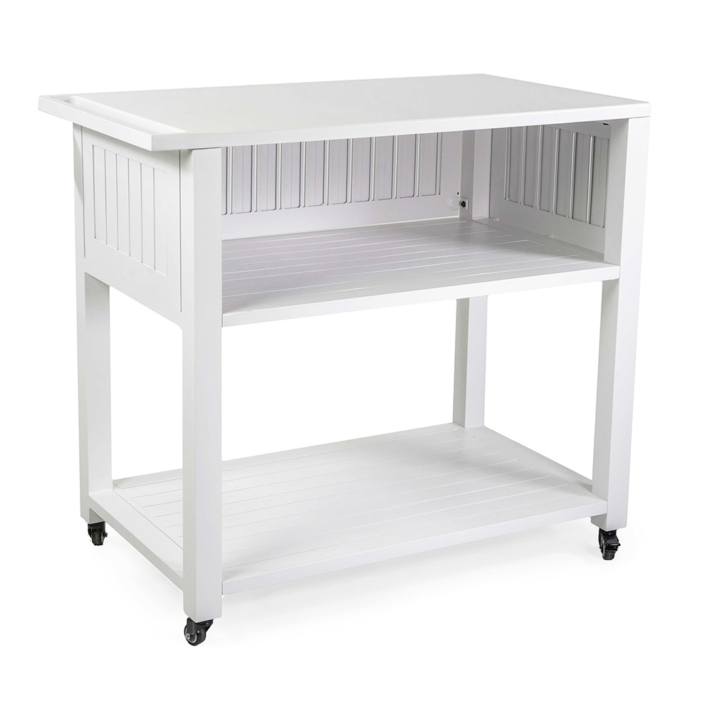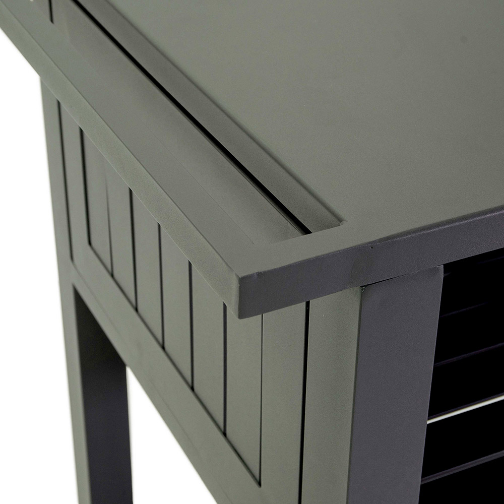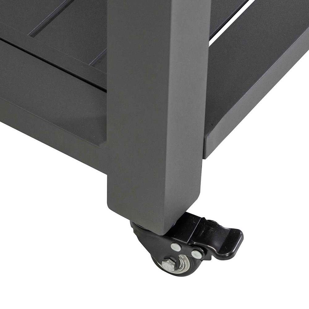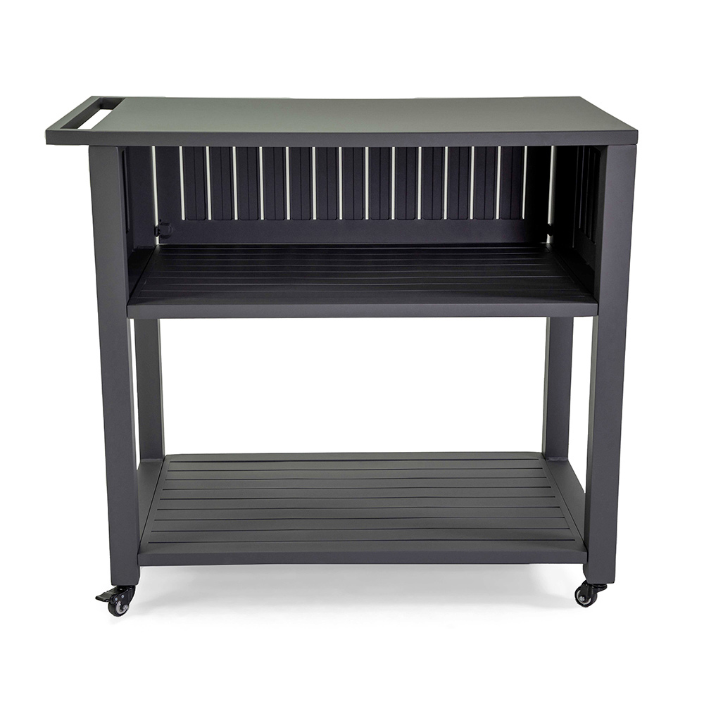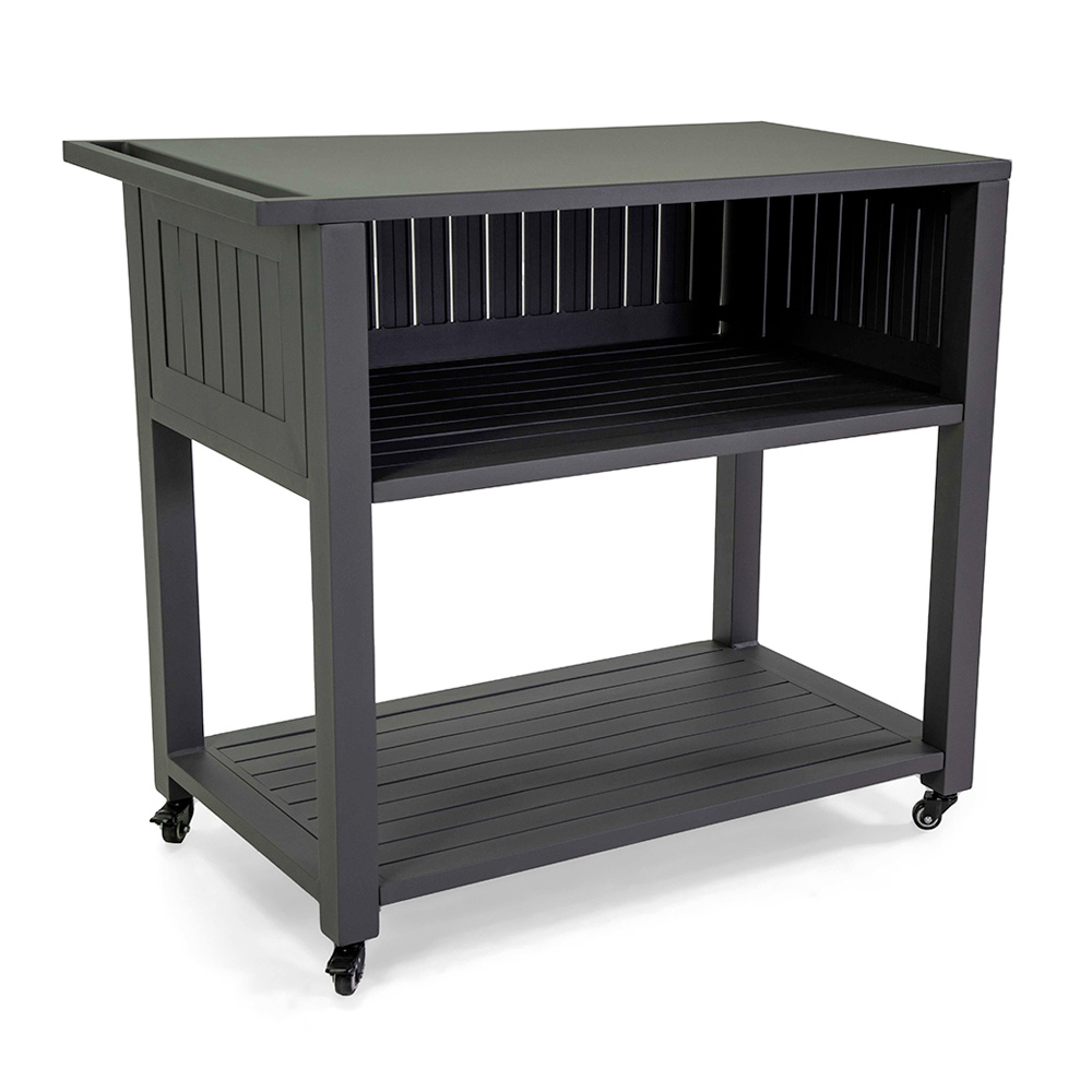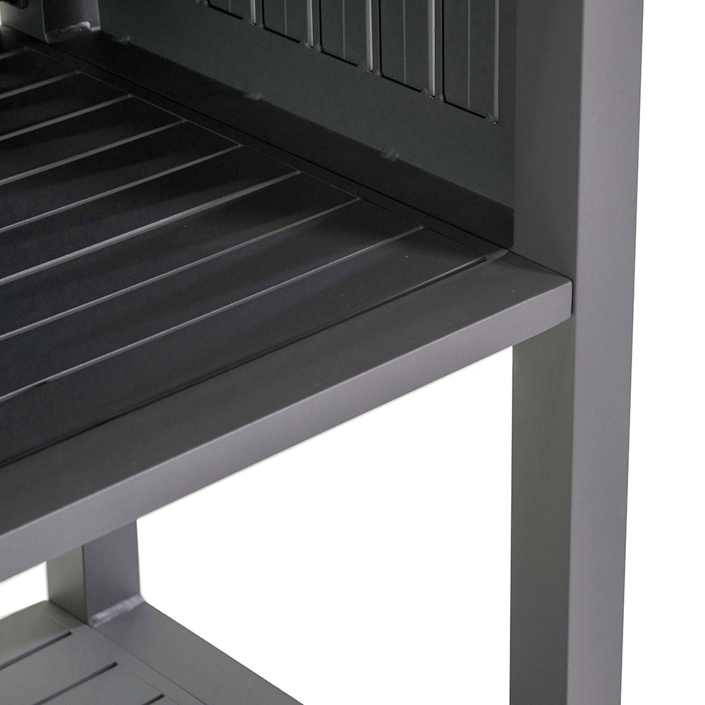 Oferecendo amplas superfícies de trabalho e armazenamento , o design inclui uma prateleira superior útil para preparar e servir, uma prateleira do meio para manter utensílios e acessórios à mão e uma grande prateleira inferior perfeita para armazenar suprimentos adicionais ou grandes ferramentas de jardim.