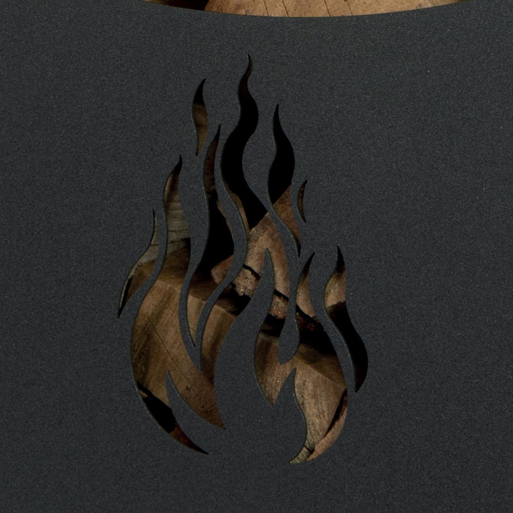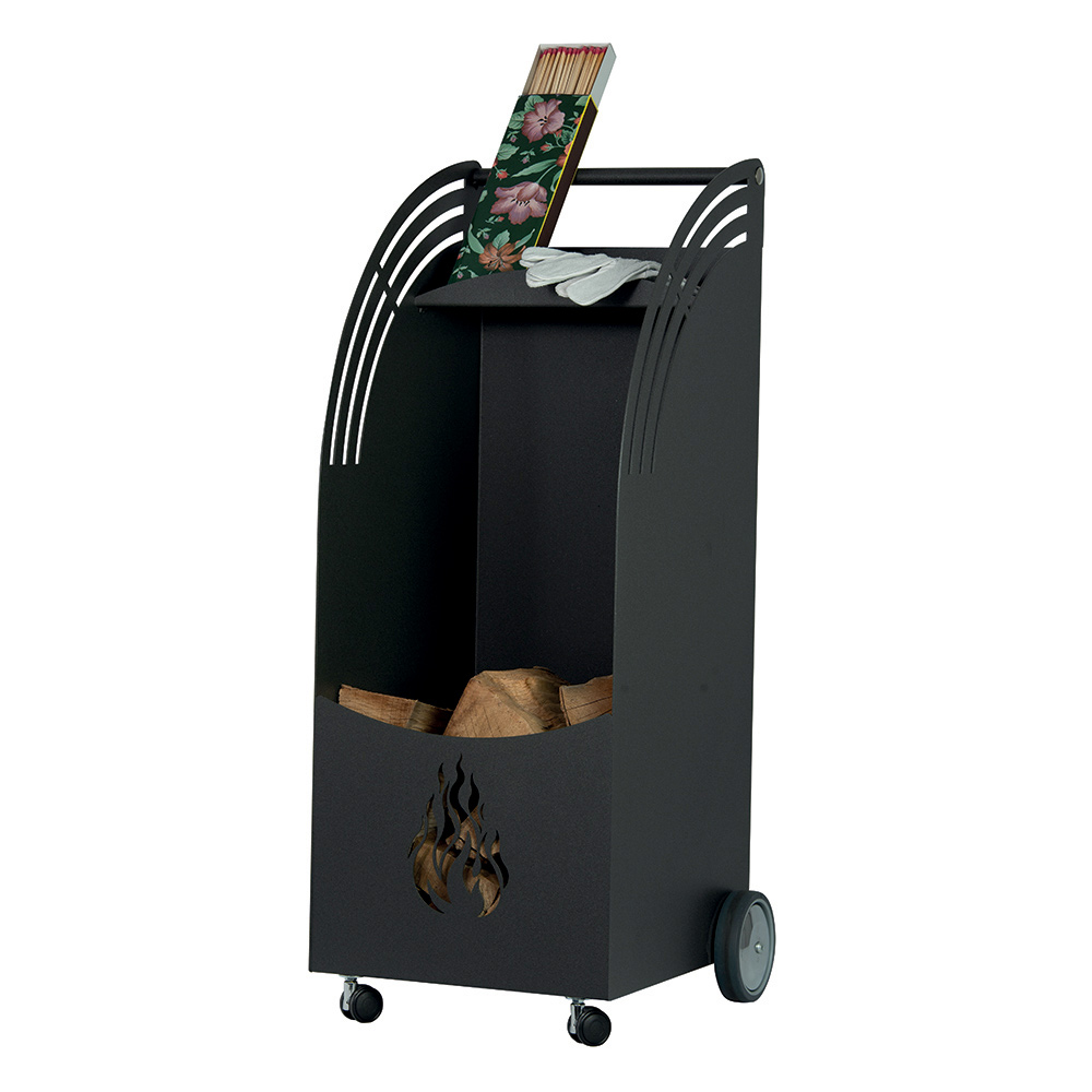 O carrinho possui rodas robustas que proporcionam fácil mobilidade, permitindo mover a madeira de uma área para outra com facilidade e sem esforço. O corte à chama no painel frontal não só enriquece esteticamente o carrinho, mas também promove a ventilação, essencial para manter a madeira seca e pronta para uso.