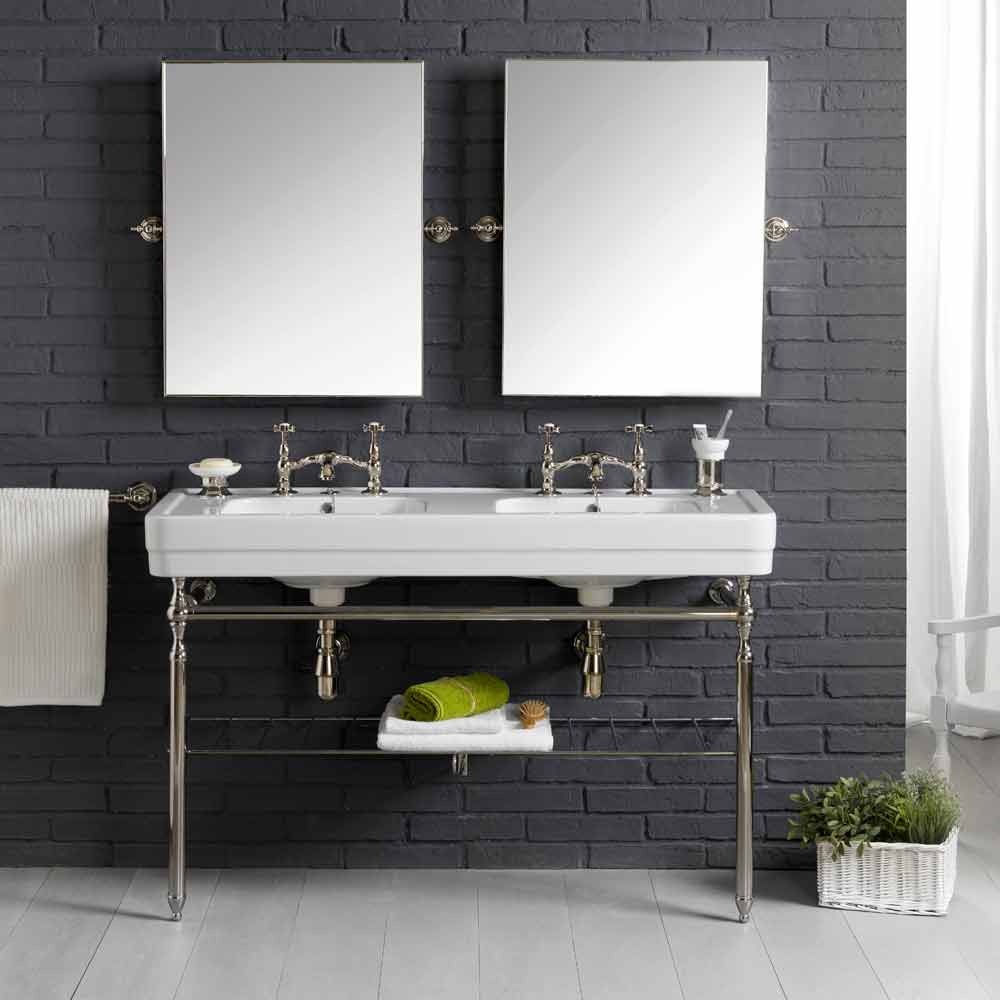 Esta bela composição inclui um lavatório duplo elegante e espaçoso fixado à parede e repousando sobre uma estrutura no elegante acabamento de níquel polido que cria delicados pontos de luz.