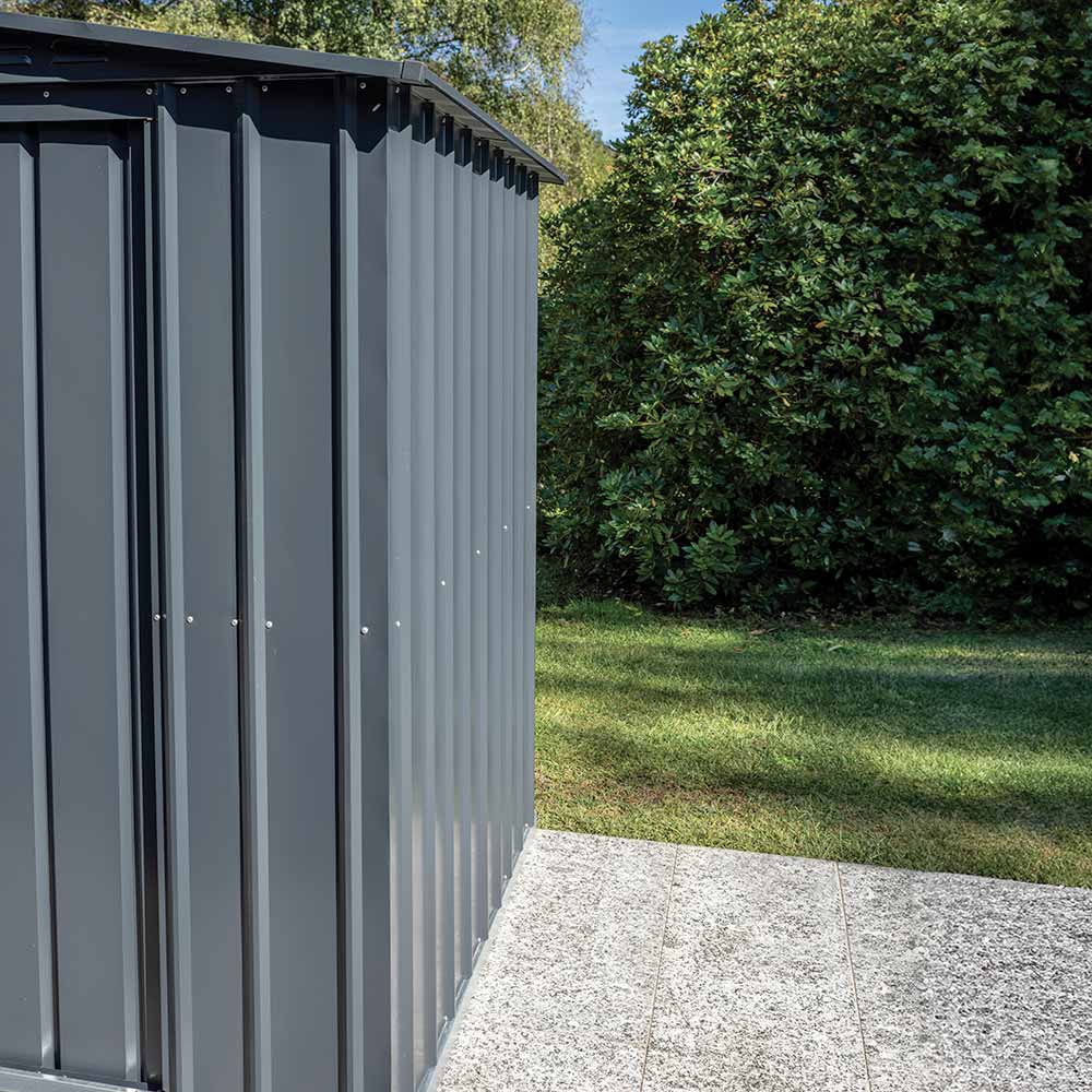 A cor escura e o design do painel vertical conferem um aspecto moderno que se adapta perfeitamente a qualquer jardim ou espaço exterior, mantendo a harmonia estética. A porta facilita o acesso e movimentação de objetos volumosos, tornando a casa extremamente funcional .