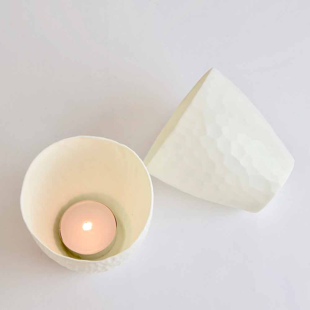 A porcelana é um material extremamente resistente que queima a uma temperatura superior à da cerâmica tradicional, por isso é mais robusto e durável, altamente resistente a manchas e impermeável, graças à sua maior densidade, dureza e uniformidade. Suas propriedades são garantidas pela dupla queima de até 1240 °, após o qual a porcelana muito translúcida assume uma preciosa cor branca quente , que esquenta ainda mais quando a vela é acesa em seu interior.