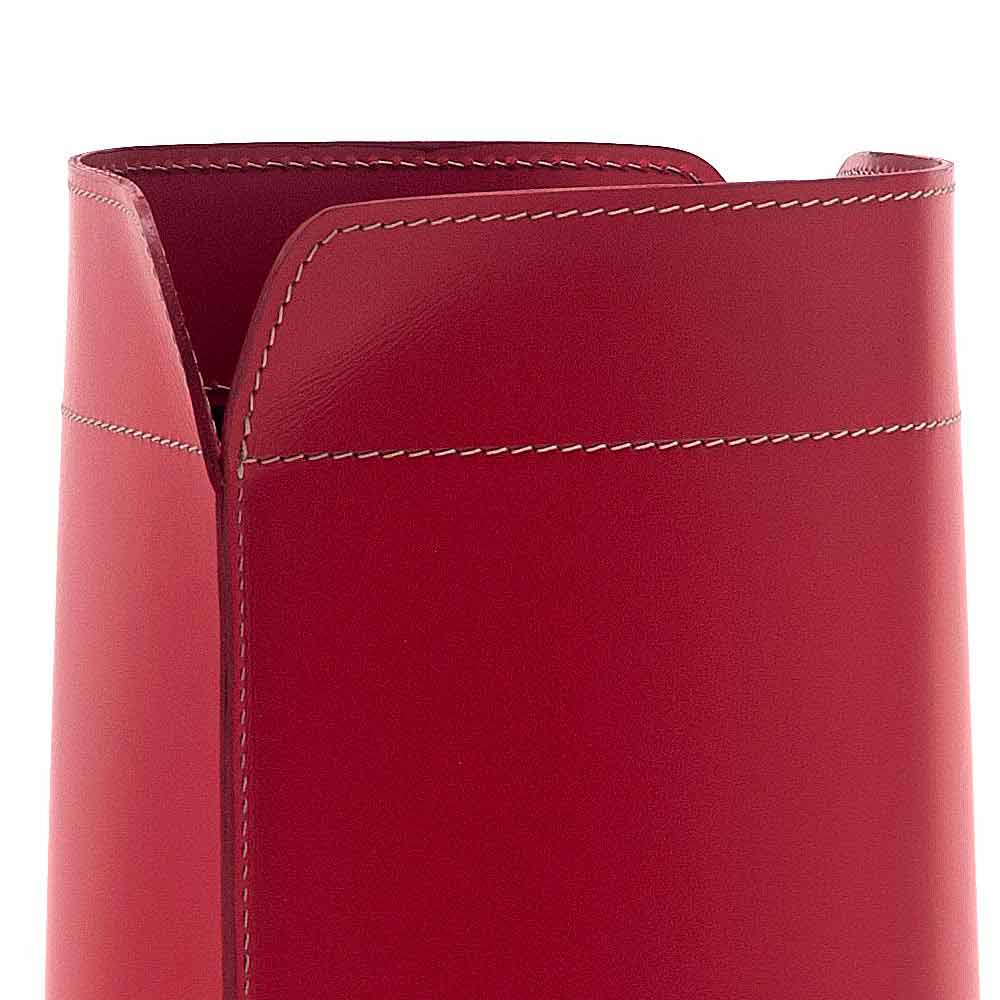 É feito de couro precioso regenerado, disponível em cores diferentes. O fundo é de madeira compensada e também é coberto de couro.