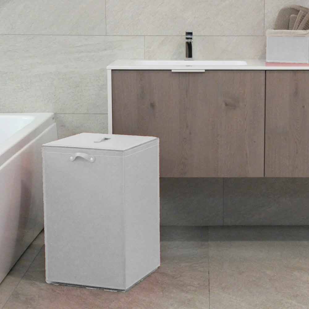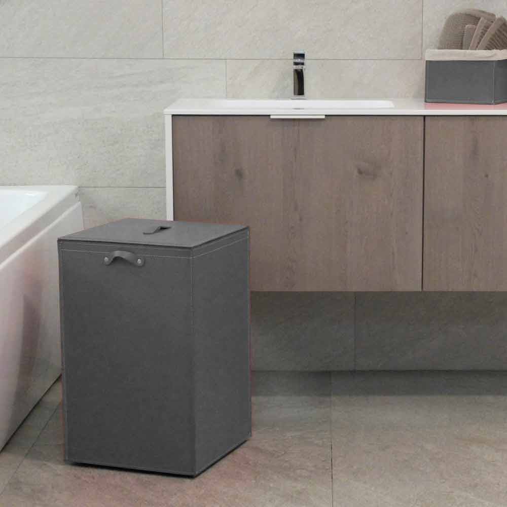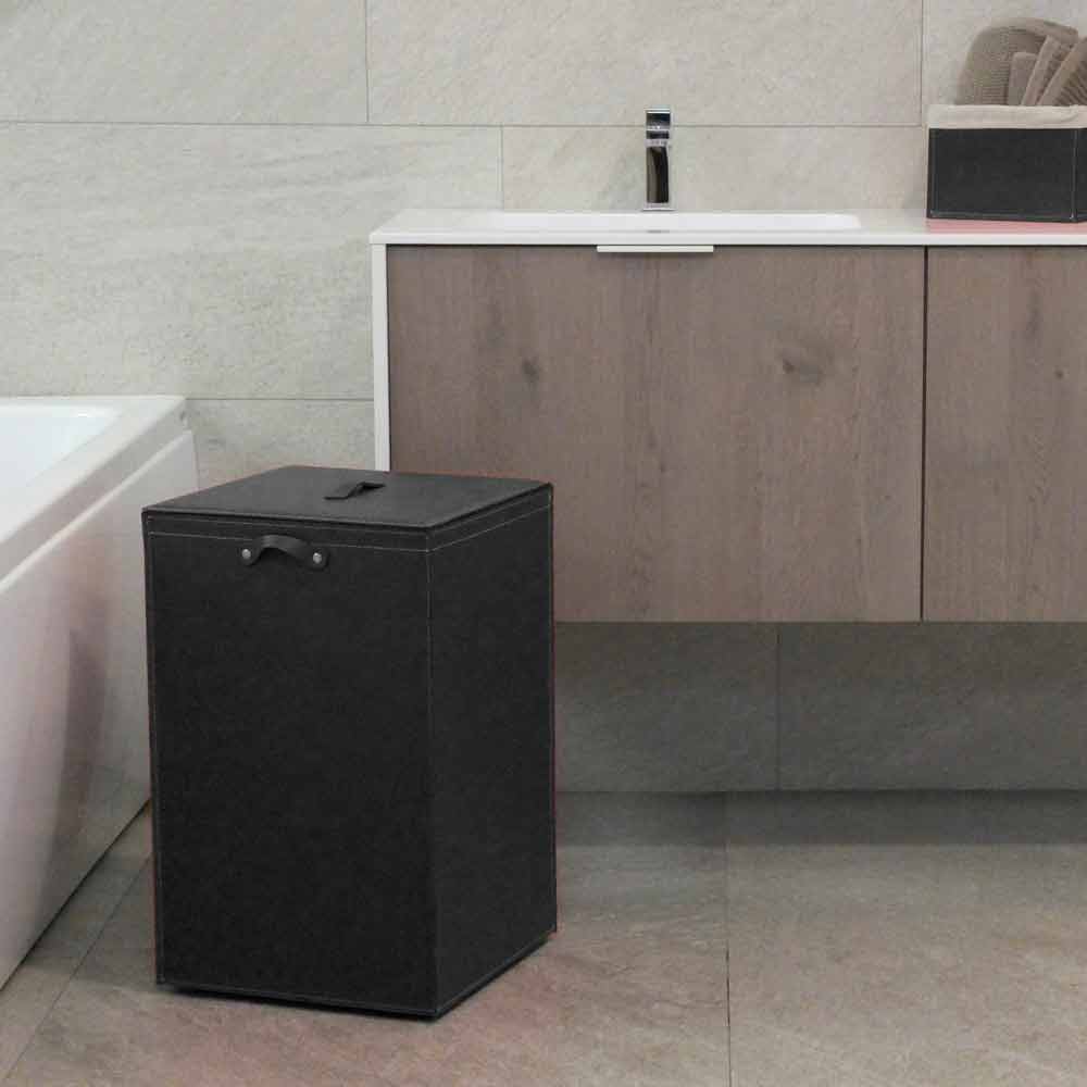 Quadrado Cesto de roupa em couro regenerado com saco interior amovível em puro algodão, estrutura em contraplacado coberto com pés de borracha.