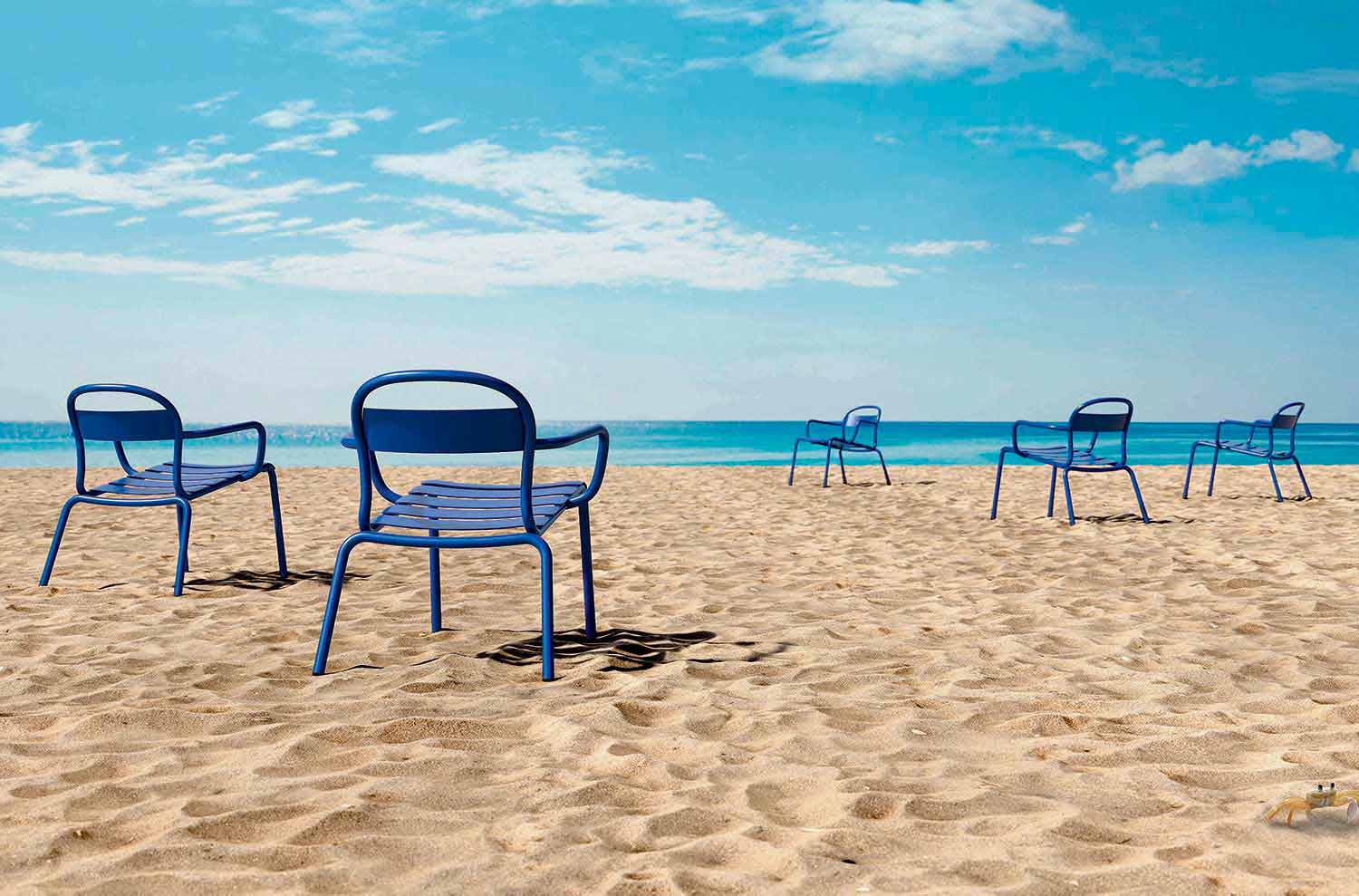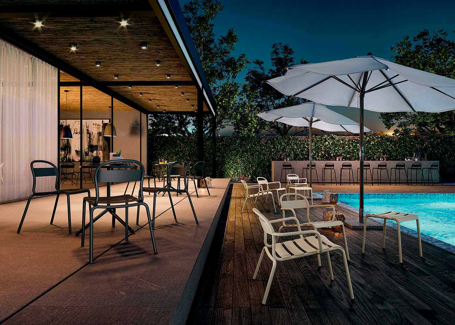 O design desta chaise-longue torna-o facilmente imaginável em um jardim ou terraço, mas não exclui seu uso mesmo em situações internas em ambientes domésticos e não domésticos. Feito inteiramente de alumínio pintado , graças às 8 cores disponíveis, adapta-se perfeitamente a qualquer situação de decoração, do mais moderno ao mais tradicional, ajudando a dar cor e personalidade ao ambiente.