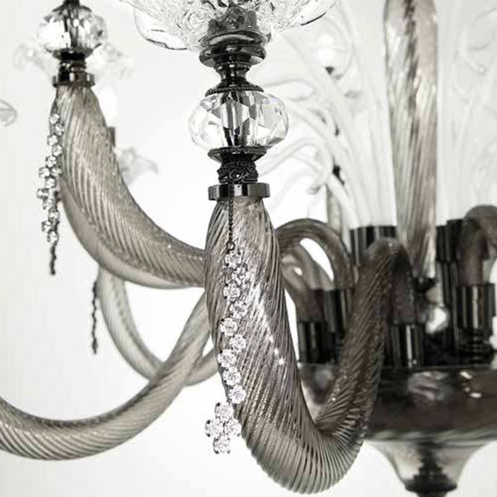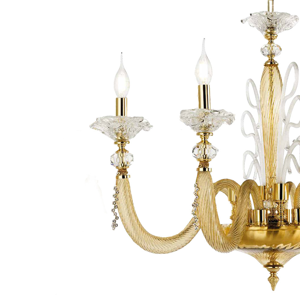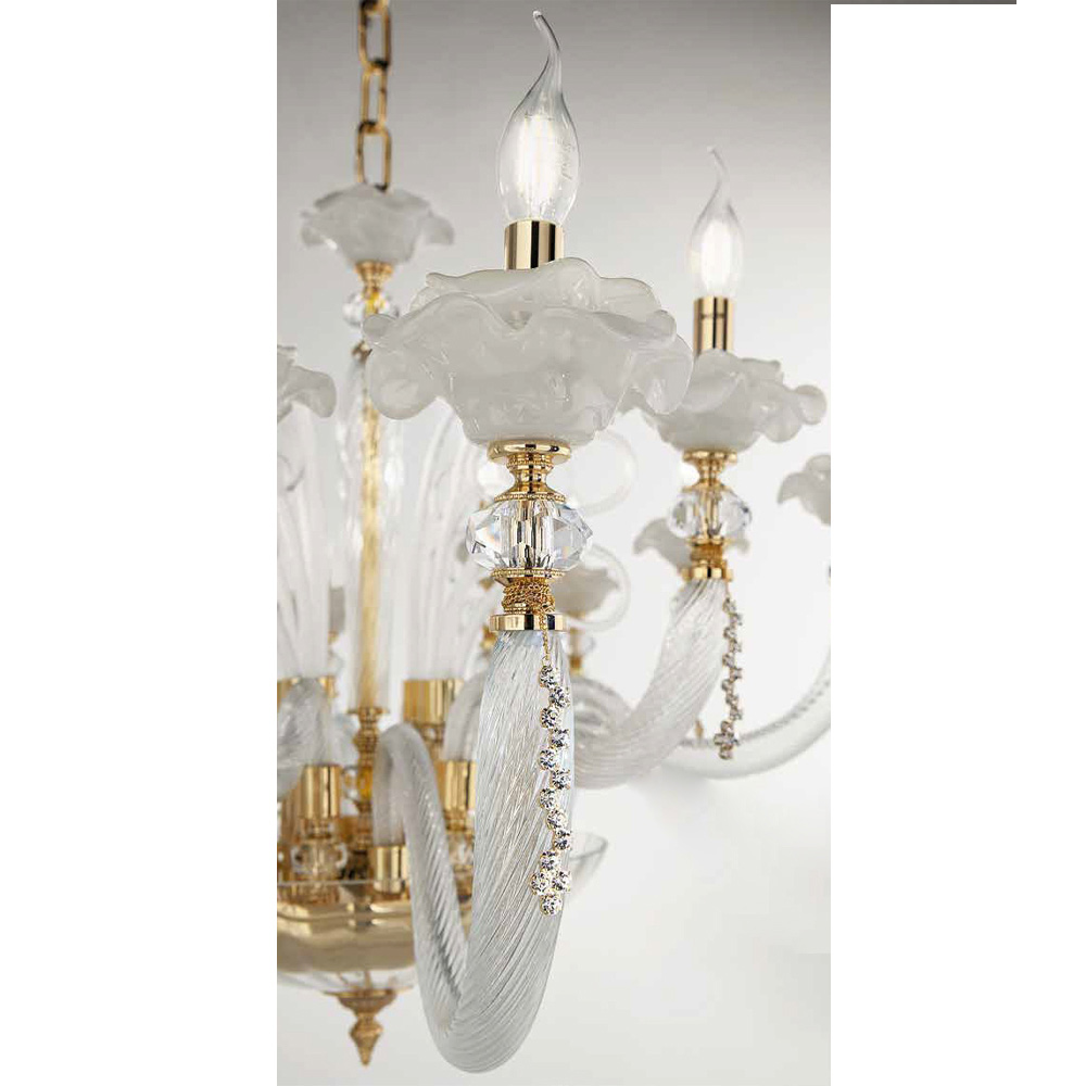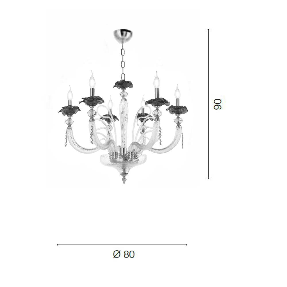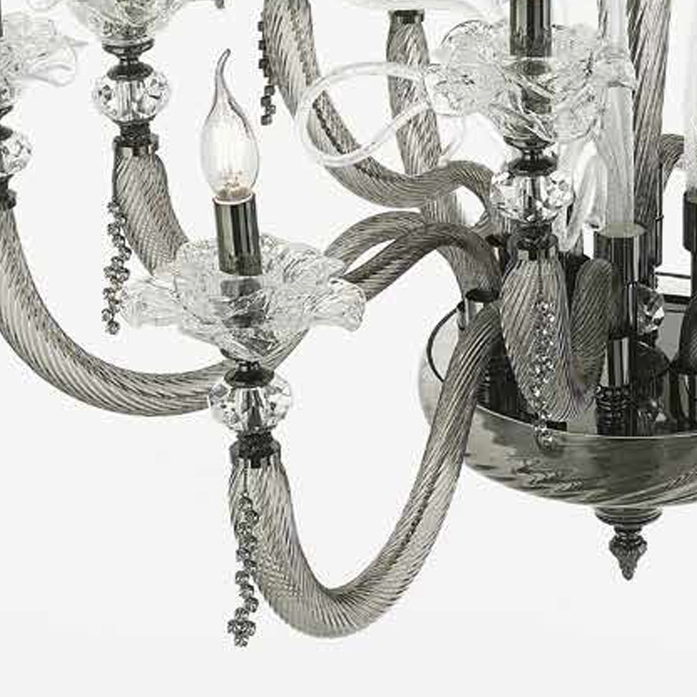 Candelabro artesanal de 6 luzes em vidro soprado e decorações florais, luxo italiano.