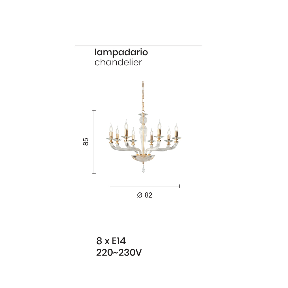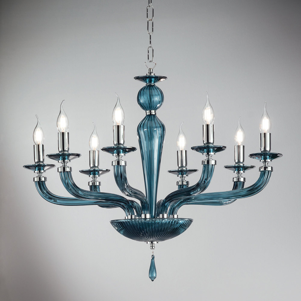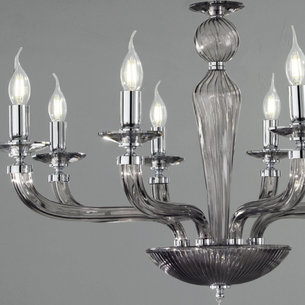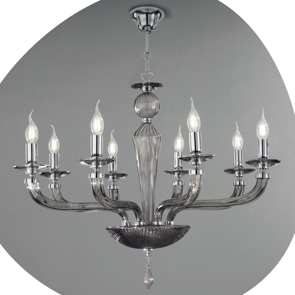 Este lustre pendente de estilo clássico é composto por 8 braços curvos feitos de vidro feito à mão na Itália com efeito "rigaton" com acabamento âmbar que sustentam os pires que abrigam as fontes de luz.