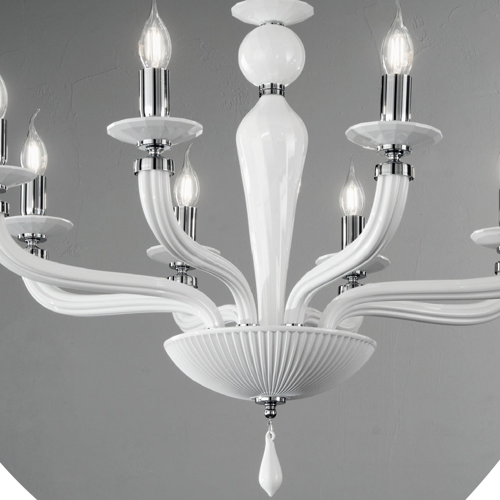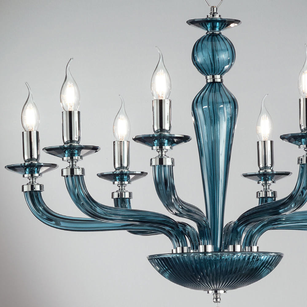 A estrutura, também em vidro pelo mesmo processo de fabricação, permite vislumbrar o núcleo metálico e é decorada com pingente de vidro.