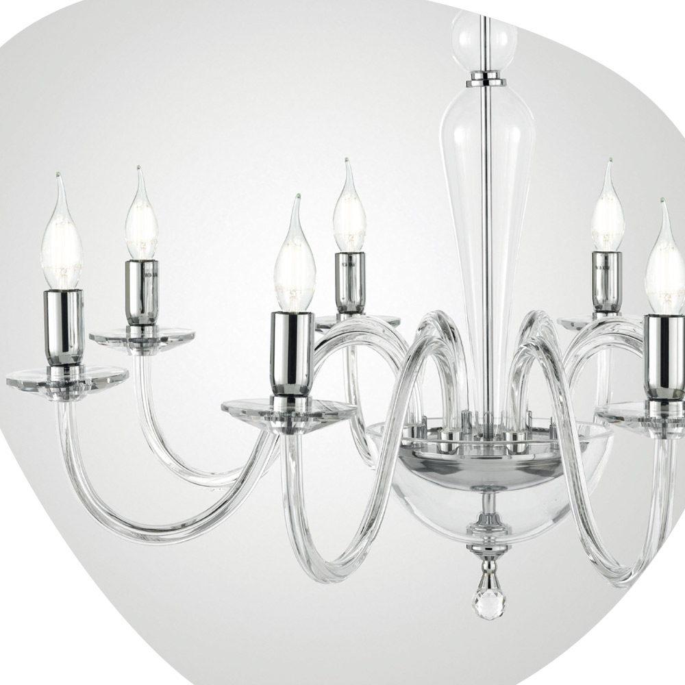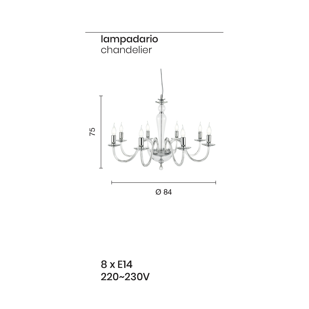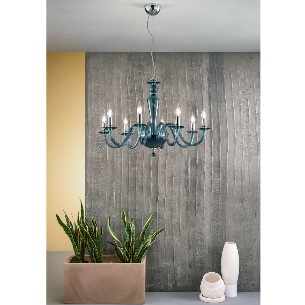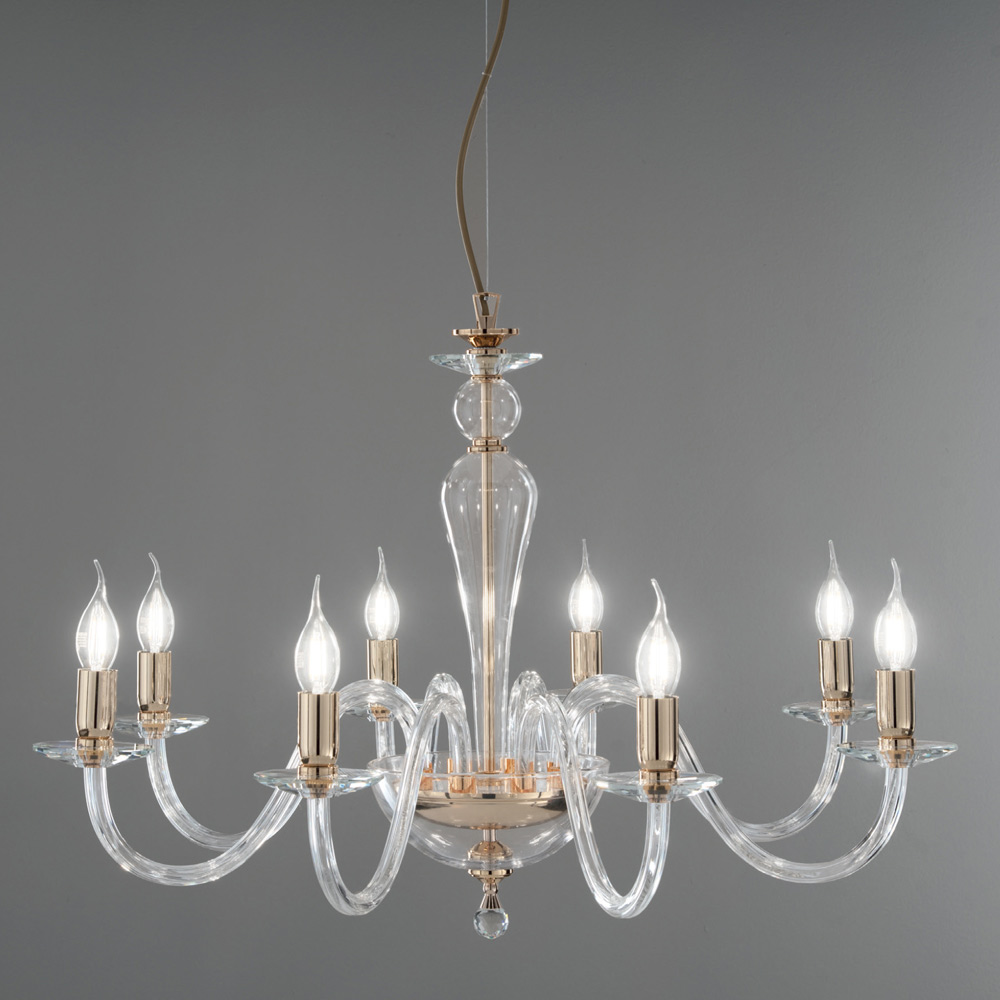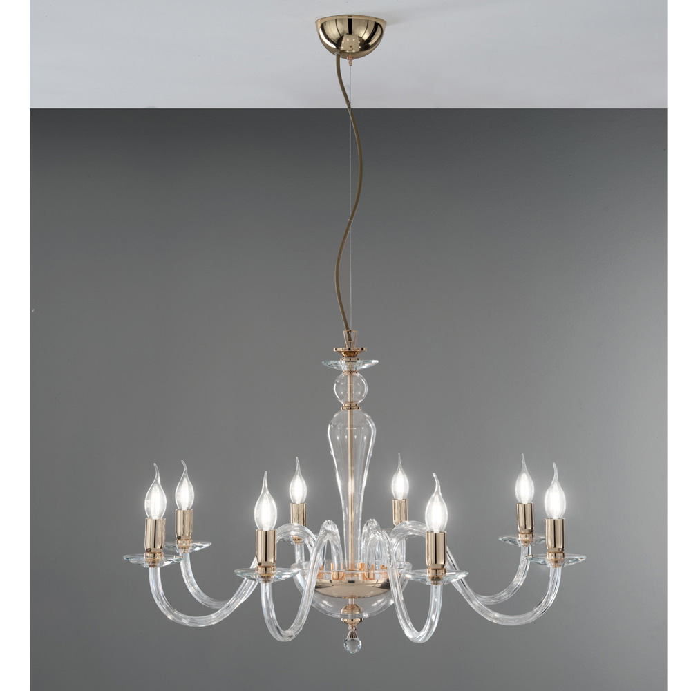 Este lustre pendente de estilo clássico é composto por 8 braços arqueados feitos de vidro artesanal na Itália que sustentam os pires que abrigam as fontes de luz.