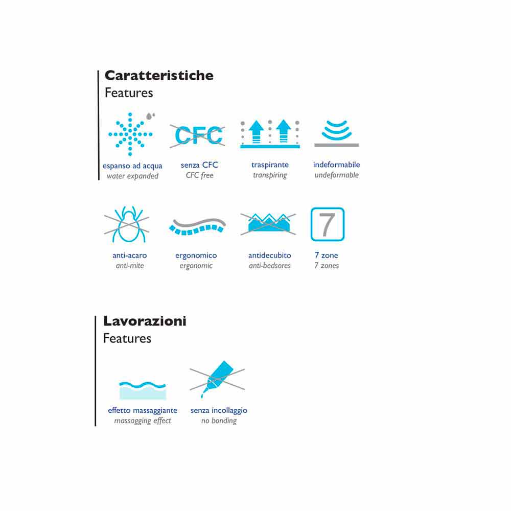 A melhor transpiração também é garantida pelo perfil particular e pelos orifícios que ligam o Memory à camada de espuma "Natura" que suporta o peso do corpo de forma correta e eficaz, também moldada na parte inferior para facilitar o uso deste produto em redes mecanizadas .
