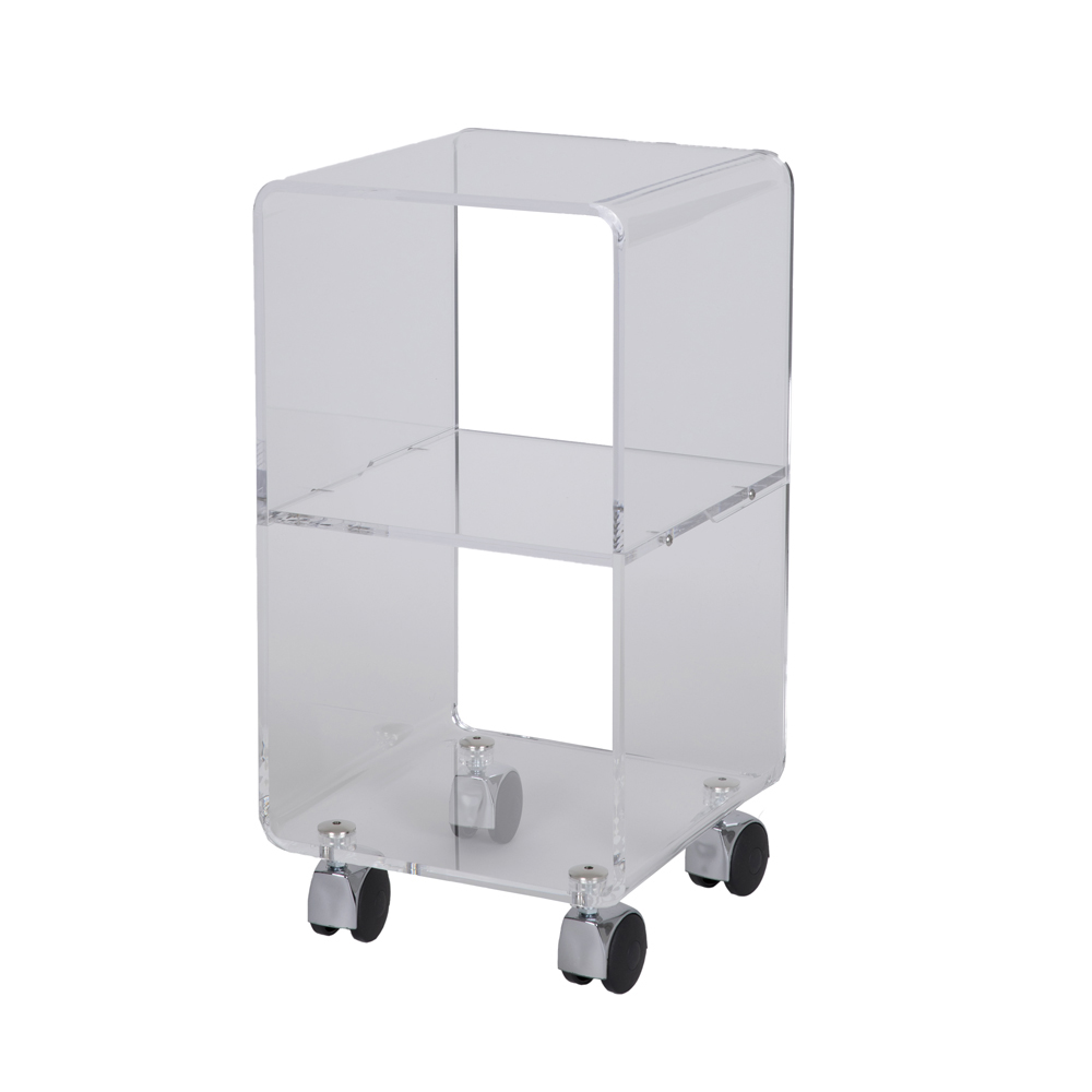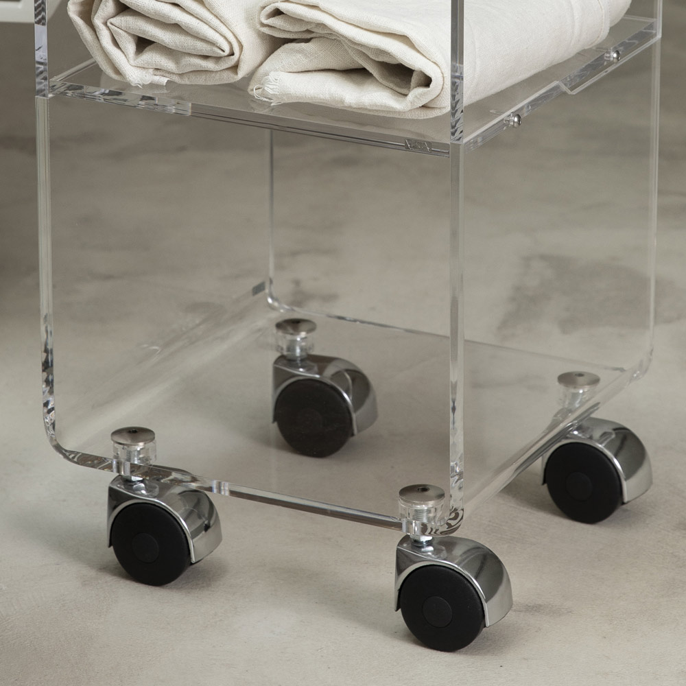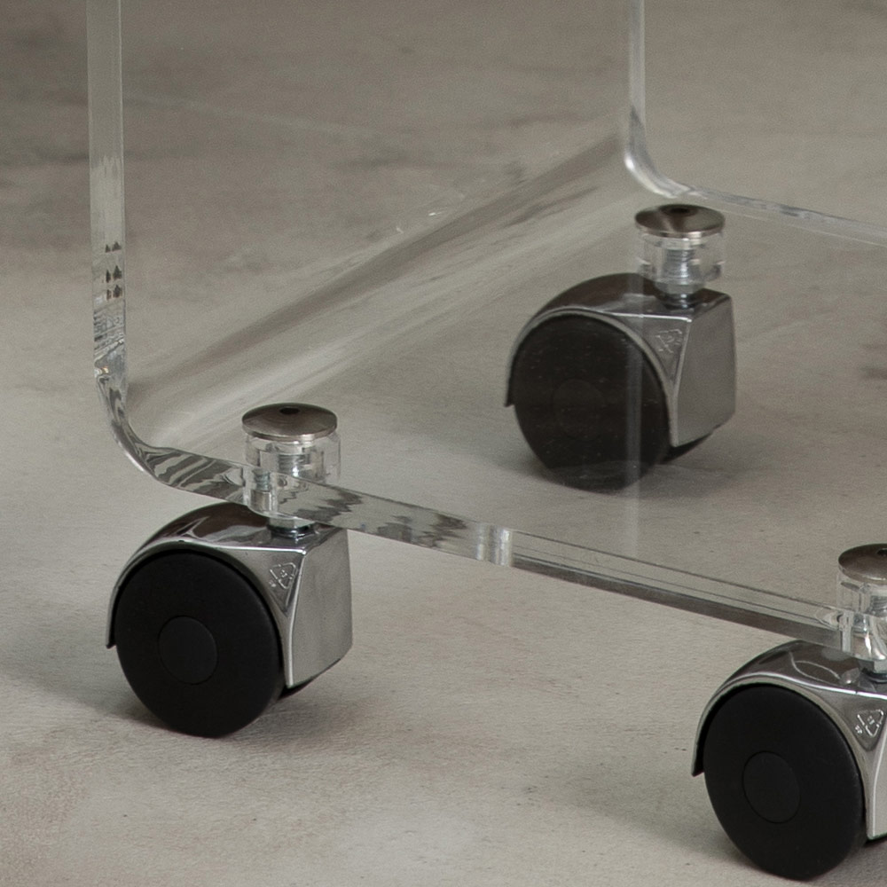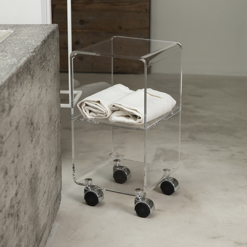 Carrinho coluna em cristal acrílico transparente com rodas e 1 ou 3 prateleiras, fabricado na Itália.