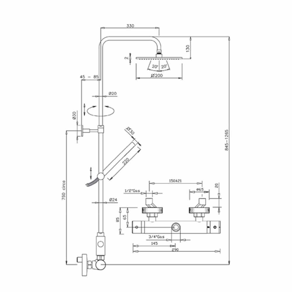 Coluna de duche em latão cromado com cabeça de chuveiro em aço e chuveiro de mão em ABS, produto de qualidade Made in Italy.