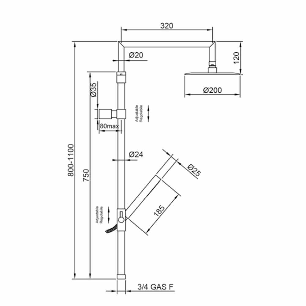 Coluna de duche em latão, aço e ABS com suporte deslizante, produto de alta qualidade Fabricado na Itália.