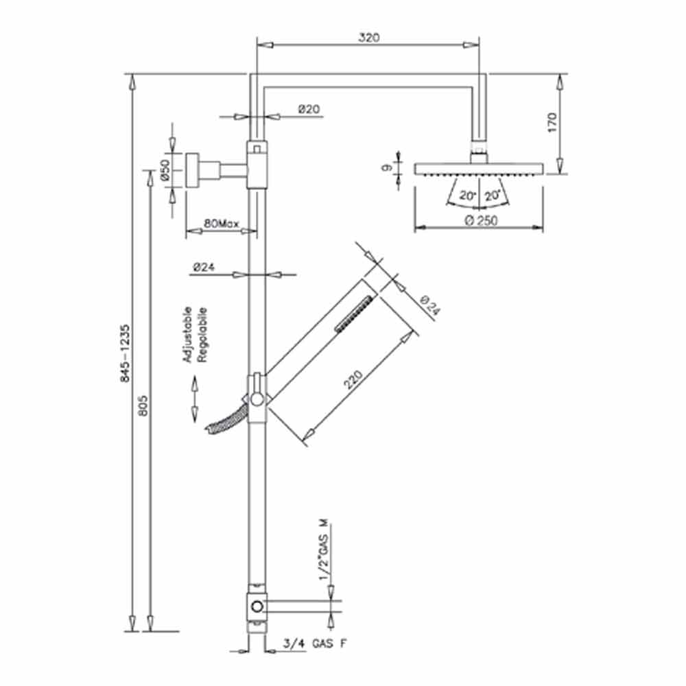 - chuveiro redondo anti-calcário em aço Ø 250 mm;
