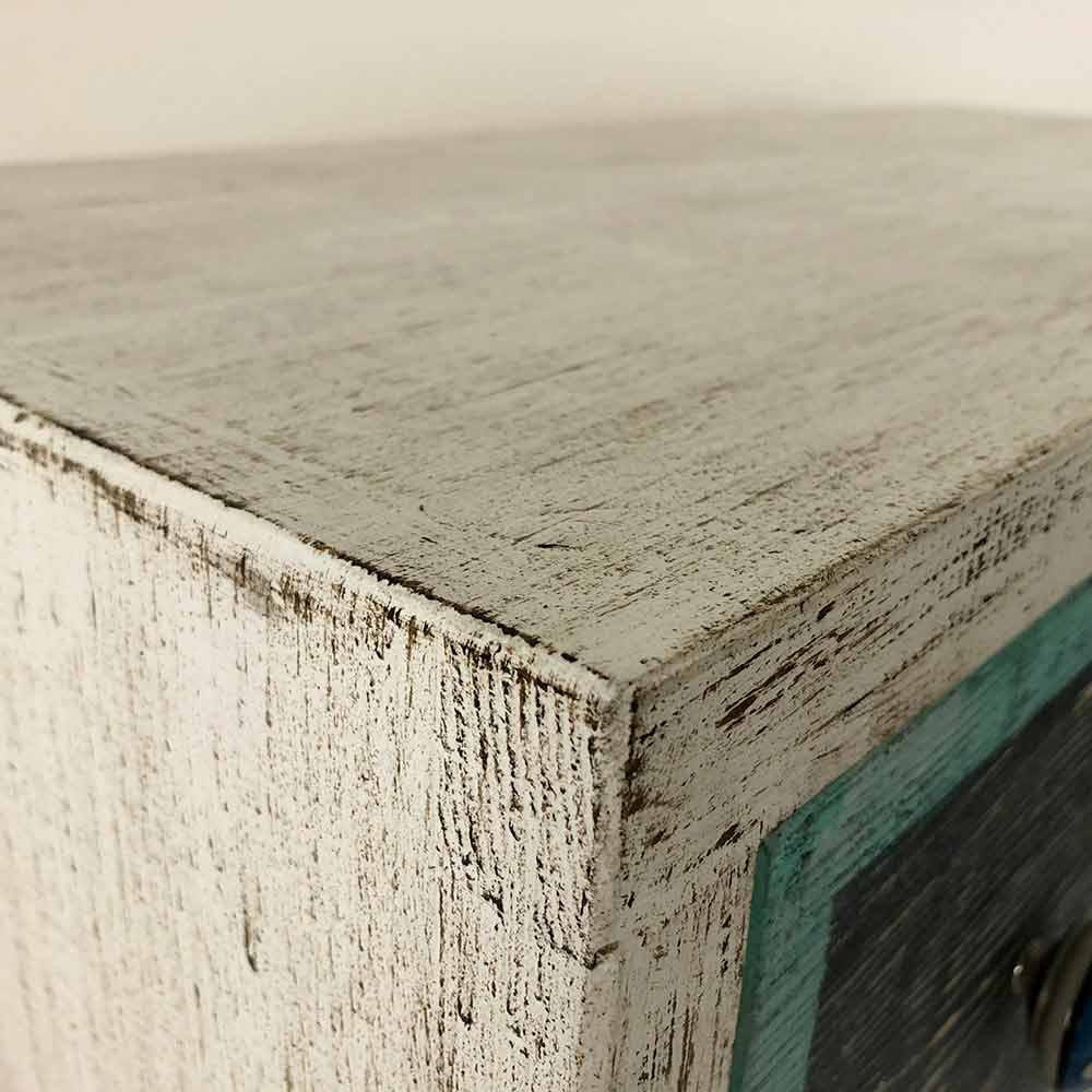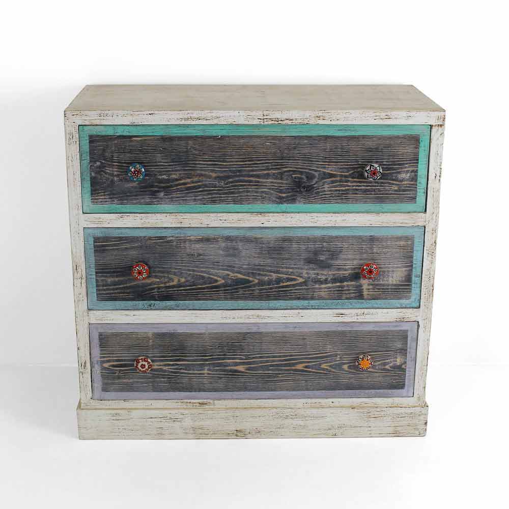 Cômoda artesanal de Itália em madeira maciça de abeto com 3 gavetas em contraplacado de choupo com frente em madeira pintada à mão e puxadores de cerâmica. A estrutura do produto tem acabamento em branco envelhecido enquanto as gavetas são decoradas em preto esfolado com bordas coloridas. Essas cores maravilhosas são obtidas graças ao uso de terras naturais agregadas a colas de origem animal, materiais escolhidos como alternativa às tintas industriais comuns. Isso é feito na tentativa de minimizar o uso de formaldeído, uma substância nociva reconhecida como cancerígena. Desta forma, é possível diminuir o nível de toxicidade, criando um produto funcional e fascinante e um ambiente mais saudável. A cômoda é finalmente completada com um acabamento transparente que a torna impermeável e fixa as cores para torná-las imutáveis ao longo do tempo.