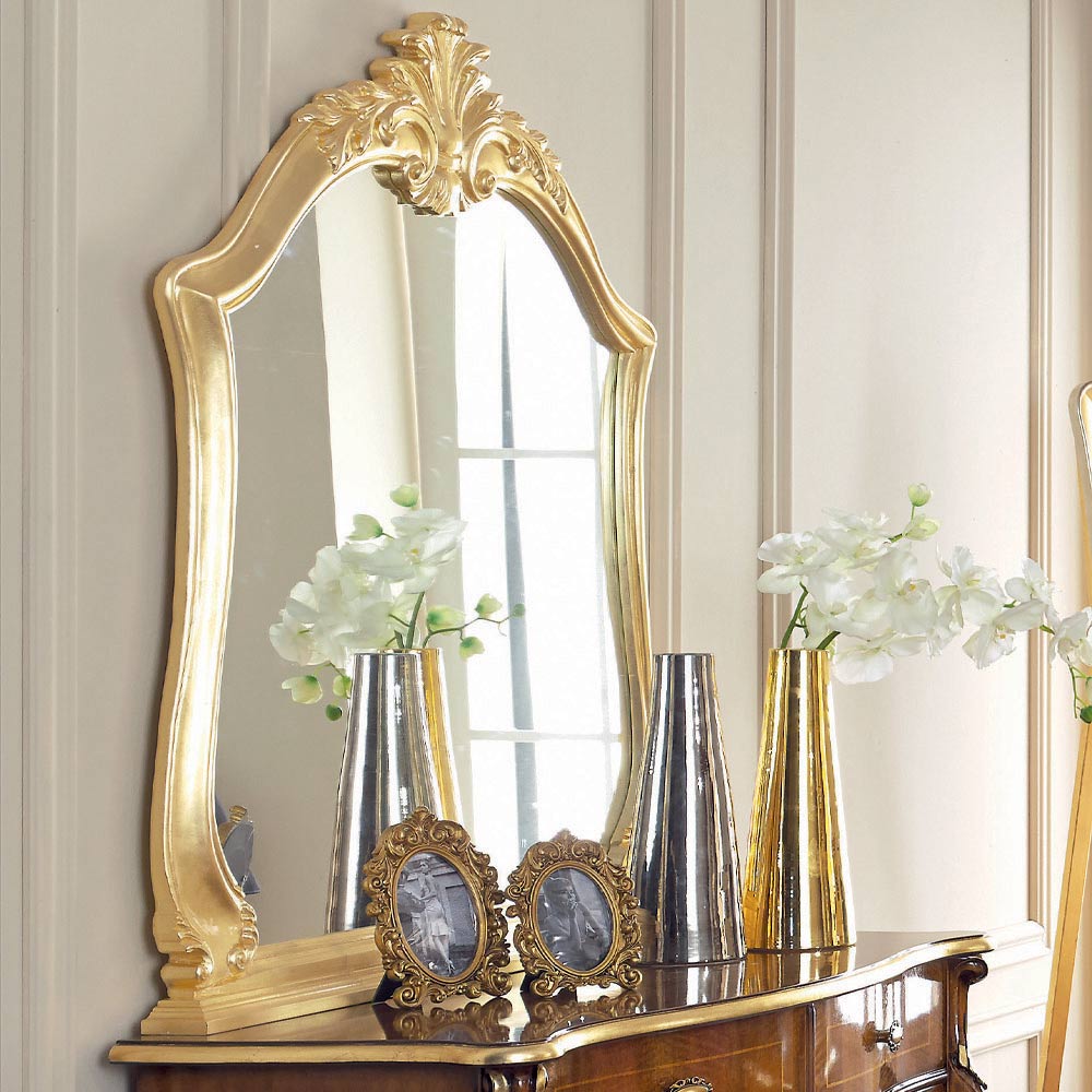 nogueira Bassano e ouro antigo com elegantes embutidos e 5 gavetas práticas. A cômoda também é completada com um espelho em forma de madeira coberta com folha de ouro.