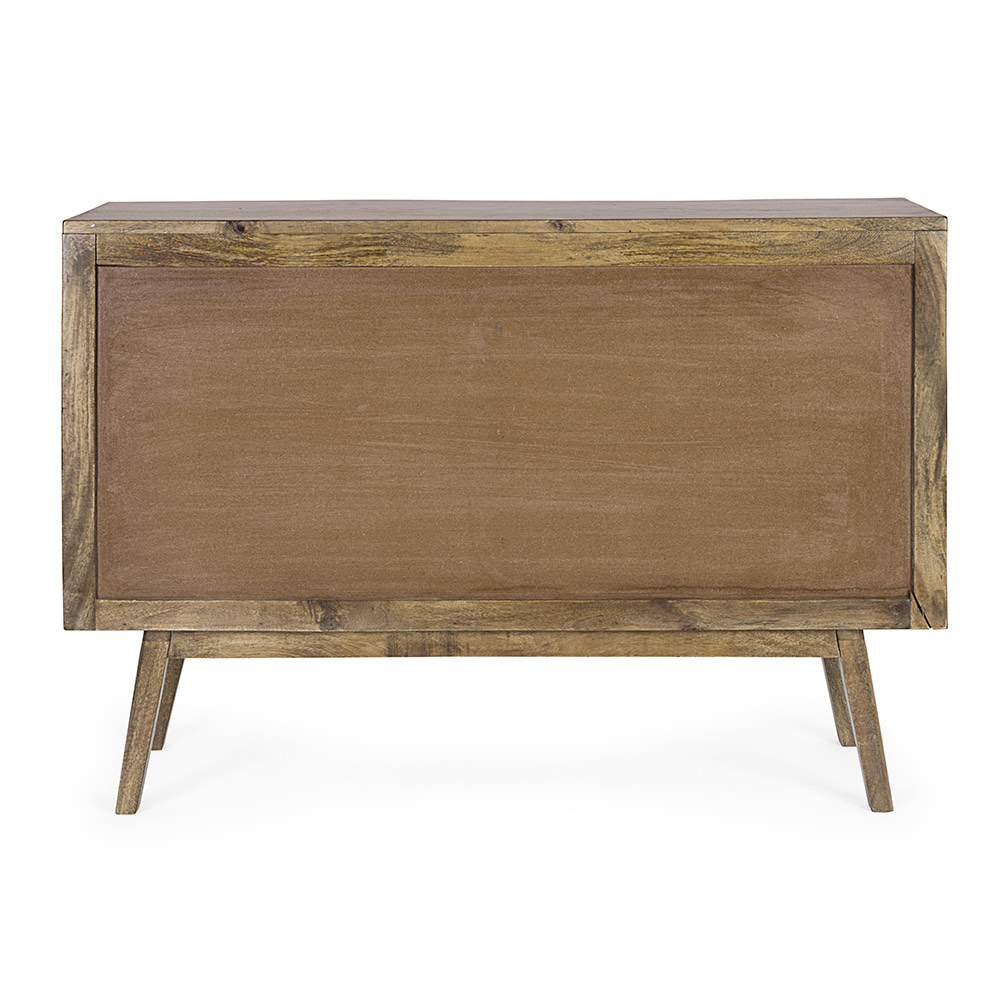 Esta cômoda de design para sala tem estrutura e pés em madeira manga com acabamento à base de água e encosto em MDF. Os puxadores são em aço e as pernas a montar. O resultado é uma peça elegante com um estilo vintage.