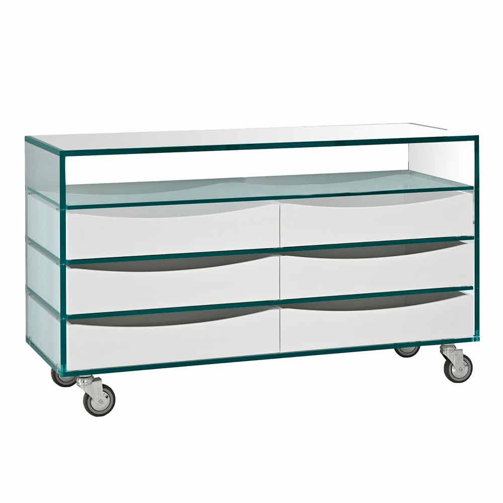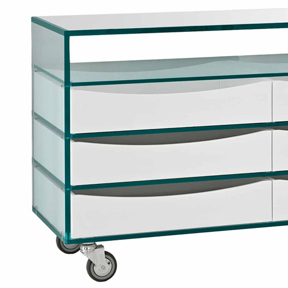 Cômoda de estilo moderno sobre rodas em vidro extraclear com seis gavetas em madeira branca, realizada à mão na Itália.