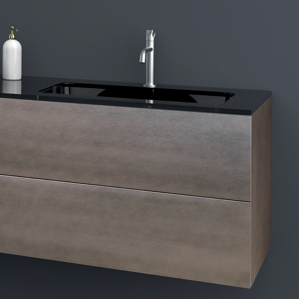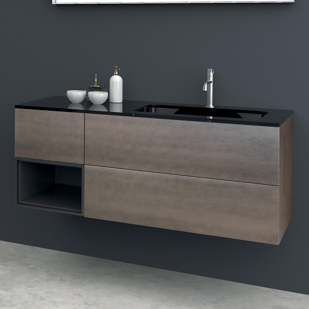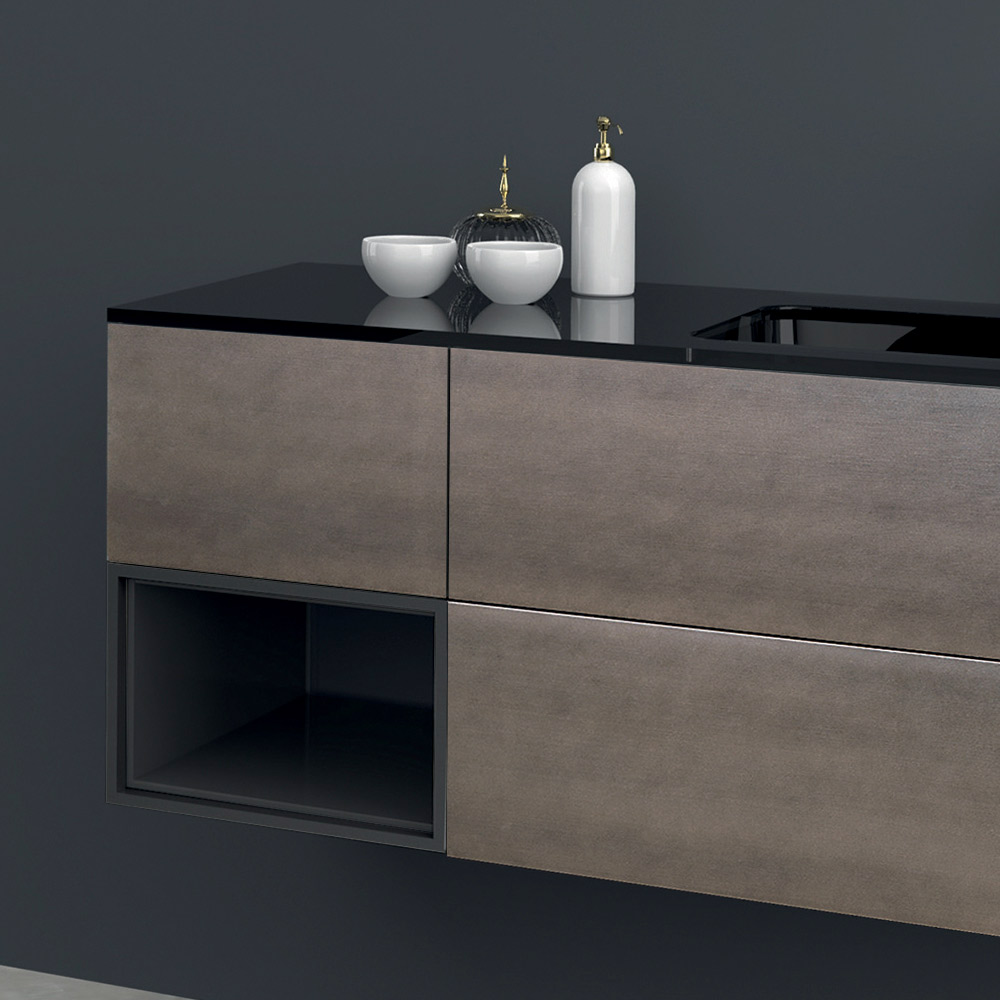 composição de mobiliário de casa de banho caracteriza-se pela pureza das linhas e pelo acabamento requintado.