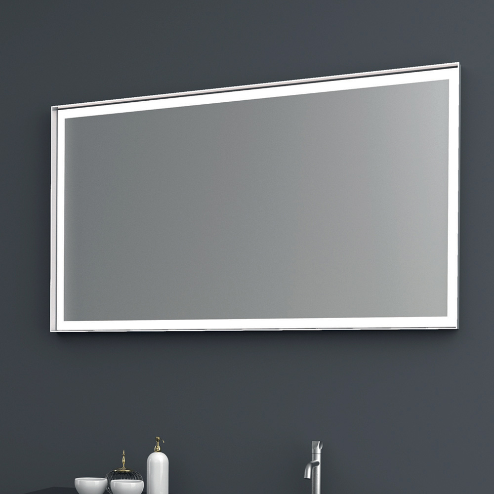 espelho jateado com iluminação LED nos 4 lados combinados com uma moldura de metal pintada de platina antiga.