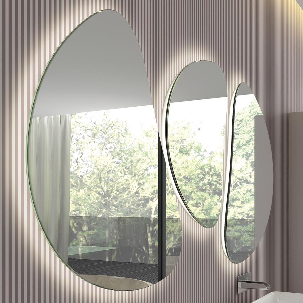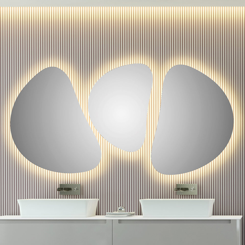 mínimas e essenciais , em forma de feijão. A retroiluminação LED de 4000k se espalha pelas bordas para uma dupla função: a de iluminação ambiente ou a iluminação direta na área da pia.