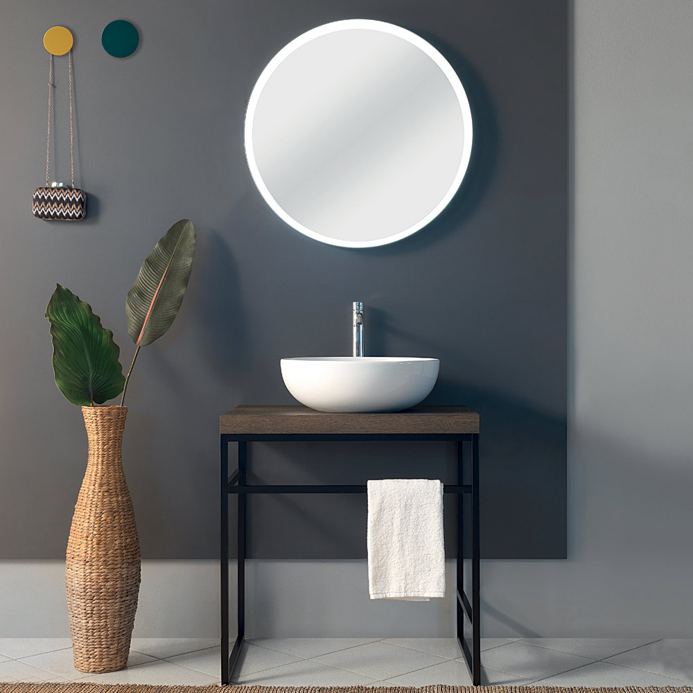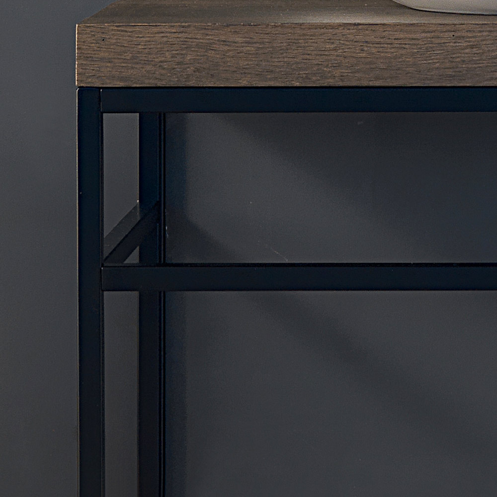 um estilo industrial. Esta elegante composição inclui uma base de lavatório aberta com porta-toalhas e espelho.