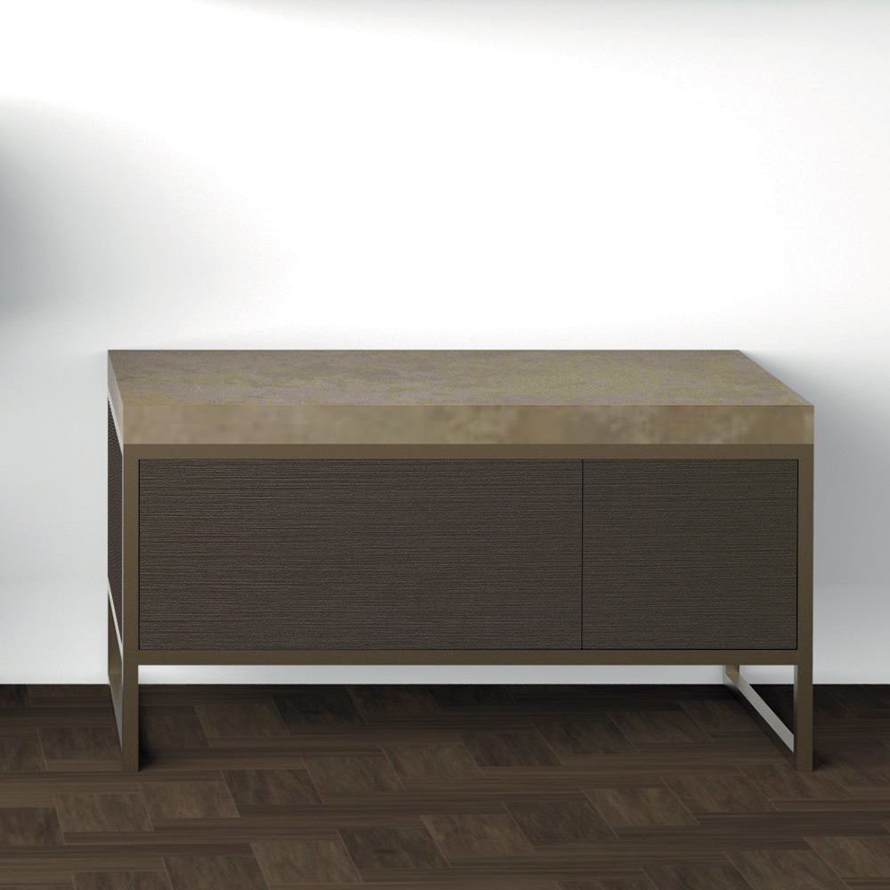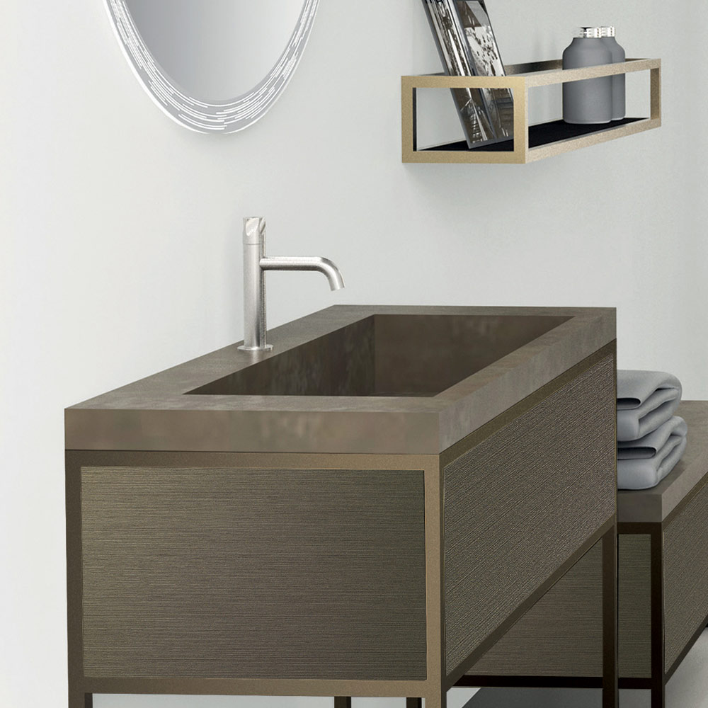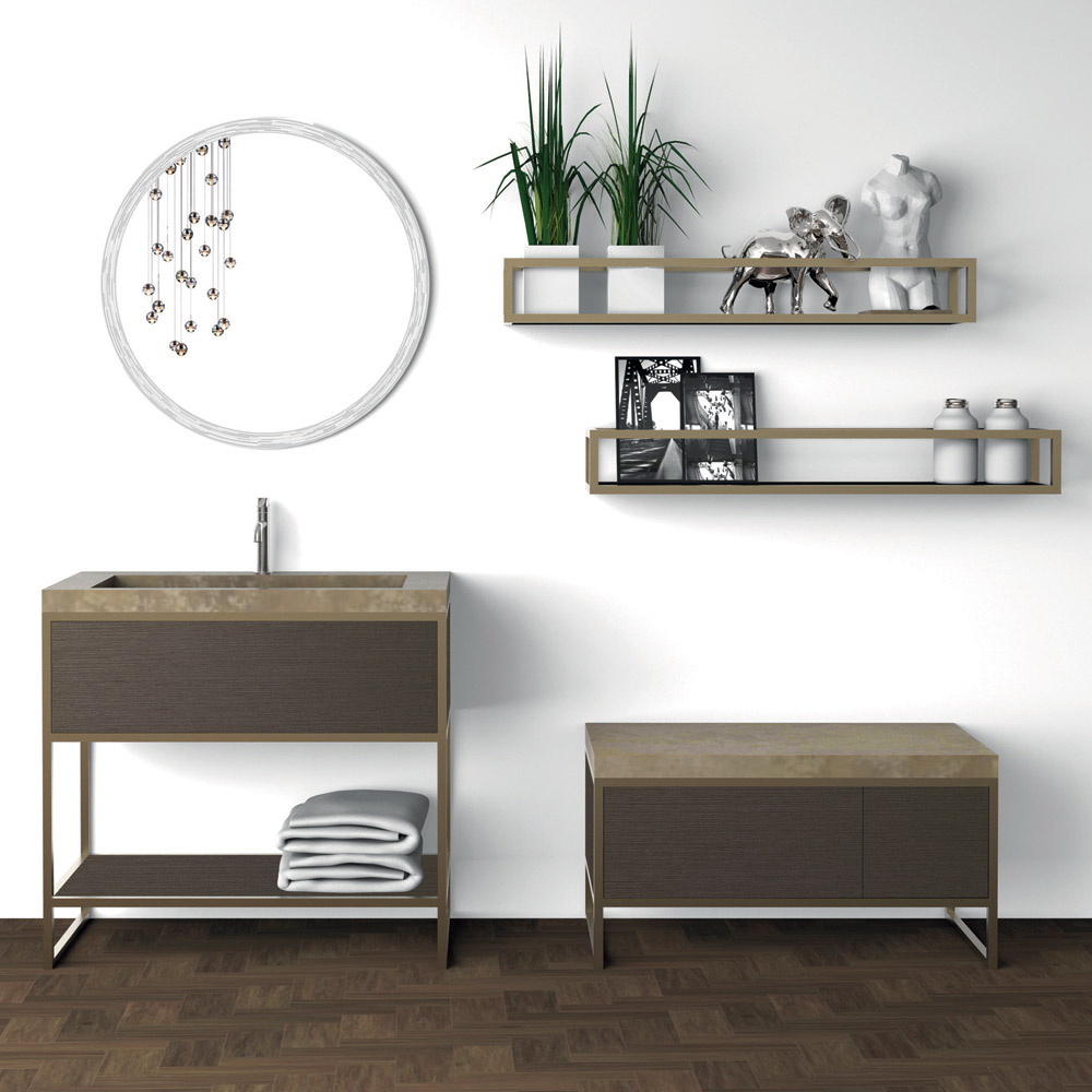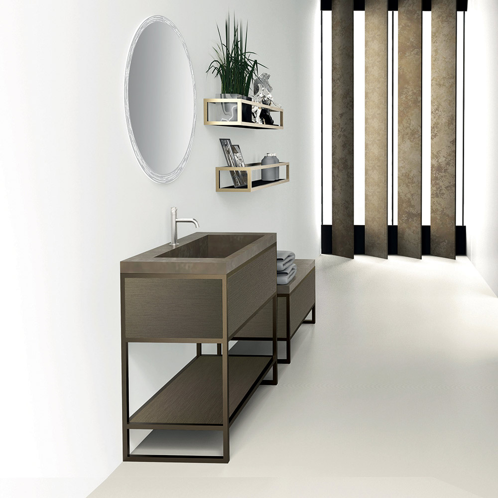 mobiliário de casa de banho caracteriza-se por uma estrutura em fino perfil metálico com acabamento em bronze antigo que emoldura as portas em metal bronze eco-madeira, criando uma combinação harmoniosa de espaços cheios e vazios. Os acabamentos metálicos das portas destacam o