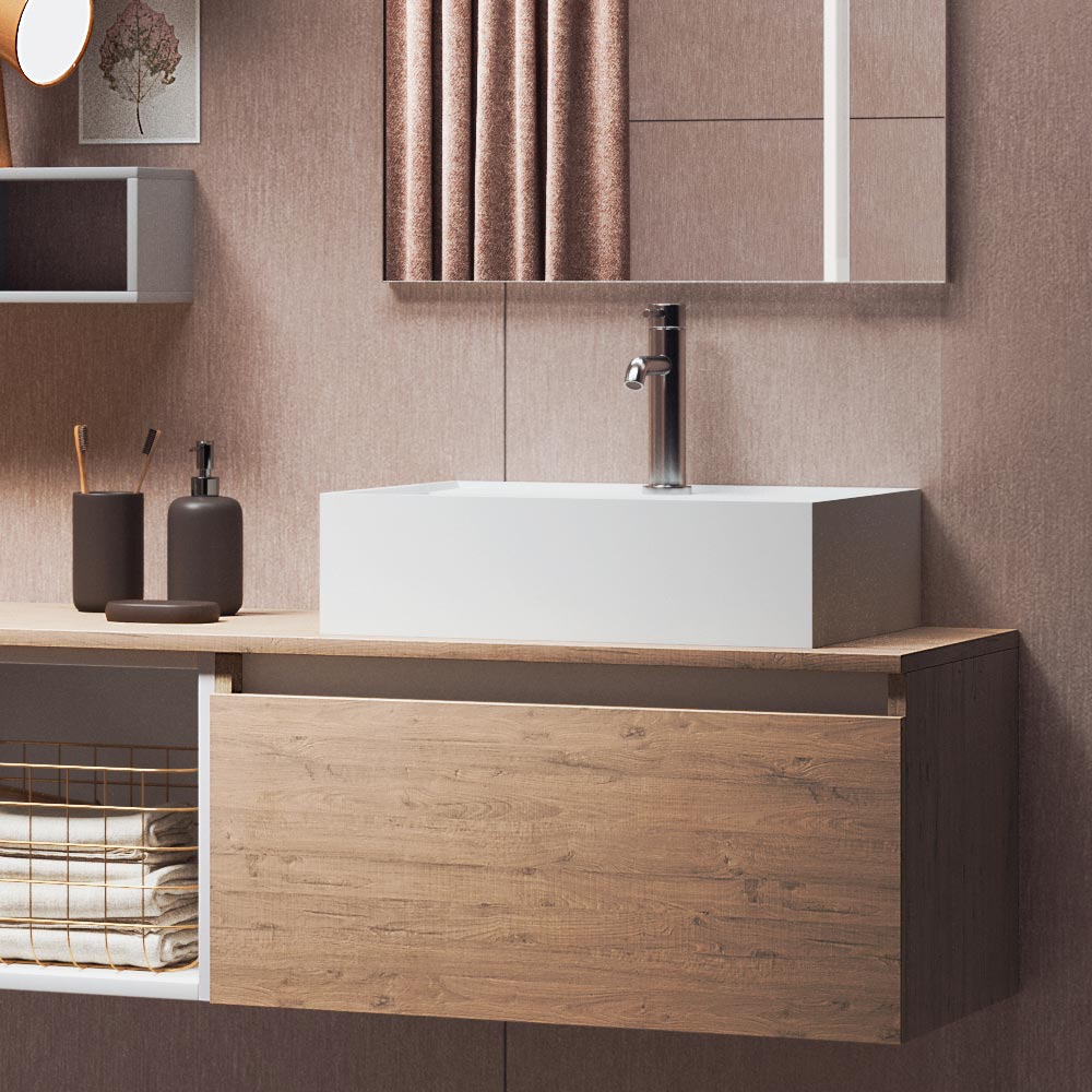 Linhas decididas e limpas unem-se nesta combinação de produtos para conferir à casa de banho um estilo requintado e elegante. Você não abre mão da funcionalidade e praticidade graças ao compartimento de arrumação e à prática gaveta e aos materiais escolhidos para sua construção.