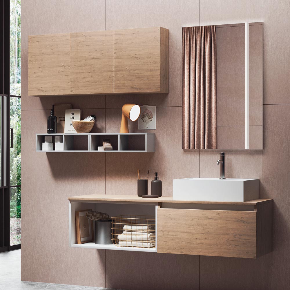 Composição de casa de banho com lavatório de bancada em cerâmica branca , espelho com moldura em ABS com LED frontal, base suspensa em melamina resistente a riscos com acabamento carvalho mel com gaveta totalmente extraível e fecho suave e móvel de parede aberto branco brilhante.