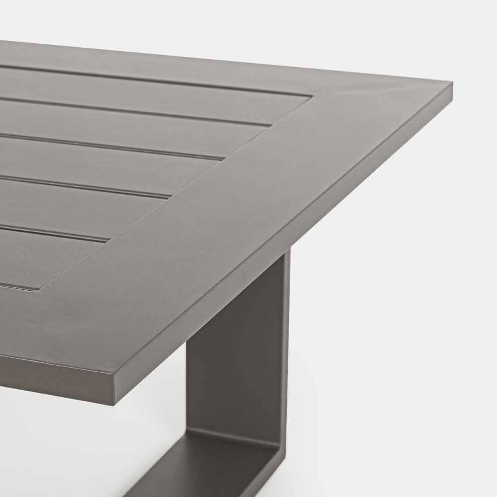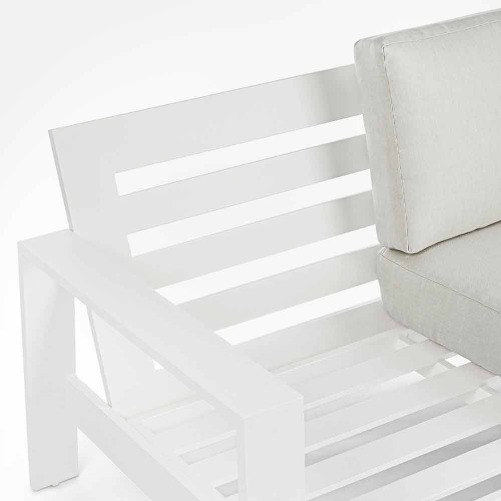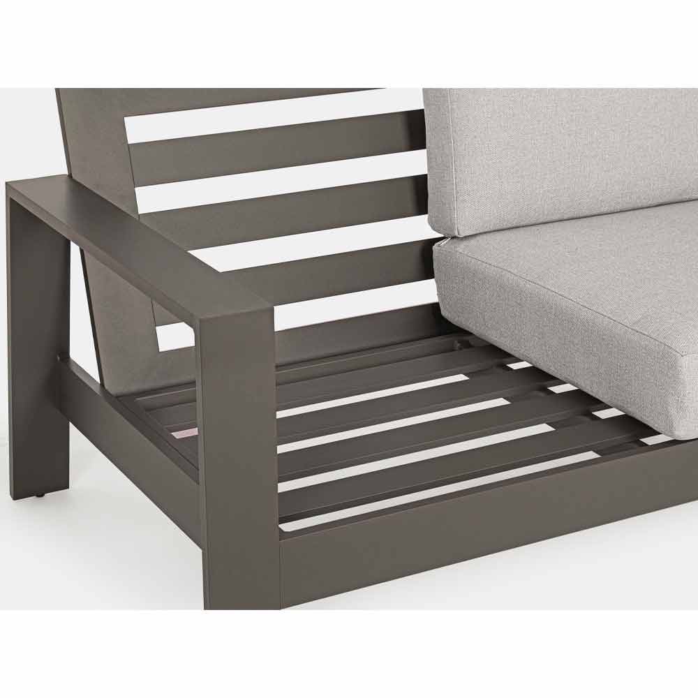 Estrutura em alumínio com revestimento em pó (poliéster). Almofadas de assento e encosto com capas removíveis em tecido olefínico (100% polipropileno). Pés ajustáveis. Parafusos de aço inoxidável. Para ser montado.